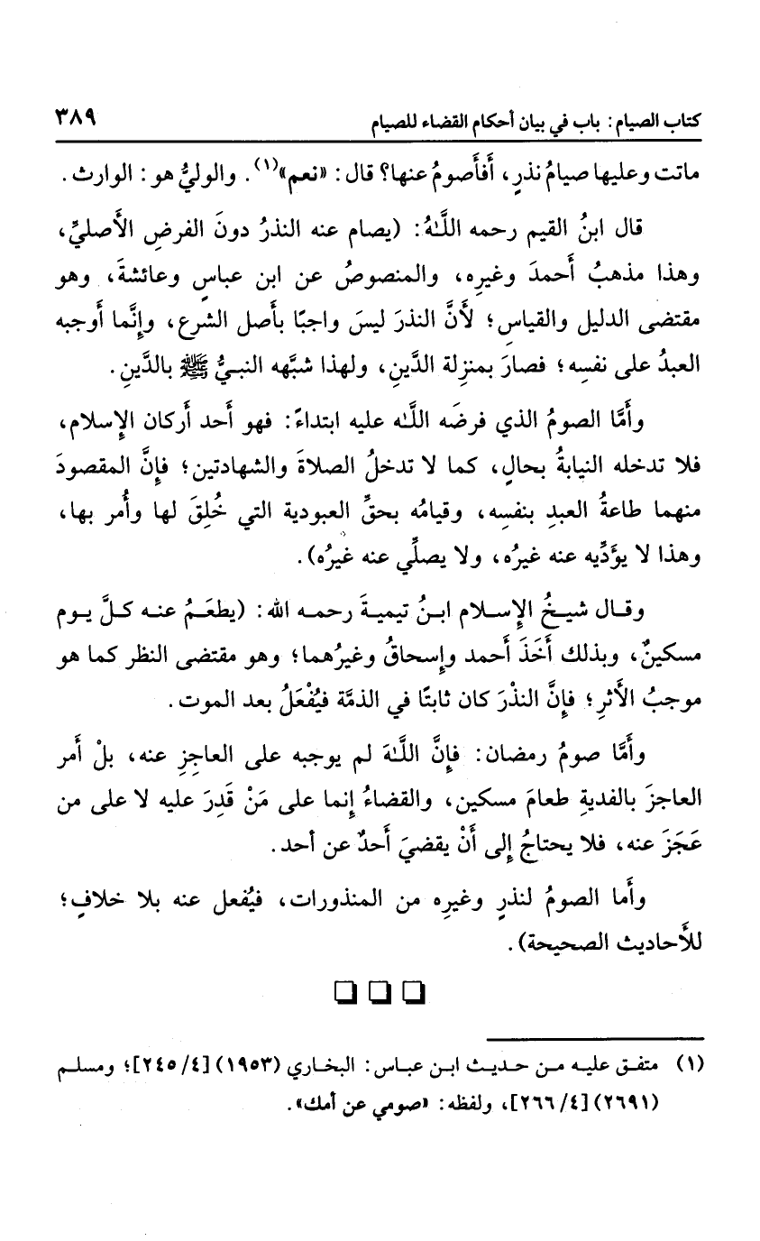 قال ابن القيم رحمه الله: "يصام عنه النذر دون الفرض الأصلي، وهذا مذهب أحمد وغيره، والمنصوص عن ابن عباس وعائشة، وهو مقتضى الدليل والقياس؛ لأن النذر ليس واجبا بأصل الشرع، وإنما أوجبه العبد على نفسه؛ فصار بمنزلة الدين، ولهذا شبهه النبي صلى الله عليه وسلم بالدين، وأما الصوم الذي فرضه الله عليه ابتداء؛ فهو أحد أركان الإسلام؛ فلا تدخله النيابة بحال؛ كما لا تدخل الصلاة والشهادتين؛ فإن المقصود منهما طاعة العبد بنفسه، وقيامه بحق العبورية التي خلق لها وأمر بها، وهذا لا يؤديه عنه غيره، ولا يصلي عنه غيره".