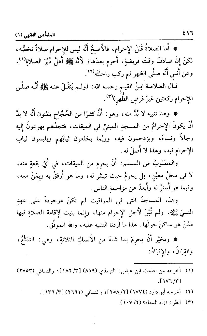 وهو أن كثيرًا من الحجاج يظنون أنه لا بد أن يكون الإحرام من المسجد المبني في الميقات، فتجدهم يهرعون إليه رجالاً ونساءً، ويزدحمون فيه، وربما يخلعون ثيابهم ويلبسون ثياب الإحرام فيه، وهذا لا أصل له، والمطلوب من المسلم أن يحرم من الميقات، في أي بقعة منه، لا في محل معين، بل يحرم حيث تيسر له، وما هو أرفق به وبمن معه، وفيما هو أستر له وأبعد عن مزاحمة الناس، وهذه المساجد التي في المواقيت لم تكن موجودة على عهد النبي صلى الله عليه وسلم، ولم تبن لأجل الإحرام منها، وإنما بنيت لإقامة الصلاة فيها ممن هو ساكن حولها، هذا ما أردنا التنبيه عليه، والله الموفق.