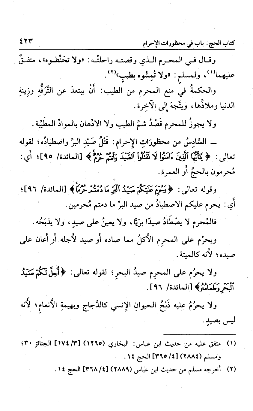 السادس من محظروات الإحرام: قتل صيد البر واصطياده؛ لقوله تعالى: {يَا أَيُّهَا الَّذِينَ آمَنُوا لا تَقْتُلُوا الصَّيْدَ وَأَنْتُمْ حُرُم} ، أي: محرمون بالحج أو العمرة، وقوله تعالى: {وَحُرِّمَ عَلَيْكُمْ صَيْدُ الْبَرِّ مَا دُمْتُمْ حُرُماً} ، أي يحرم عليكم الاصطياد من صيد البر ما دمتم محرمين؛ فالمحرم لا يصطاد صيدًا بريا، ولا يعين على صيد، ولا يذبحه.