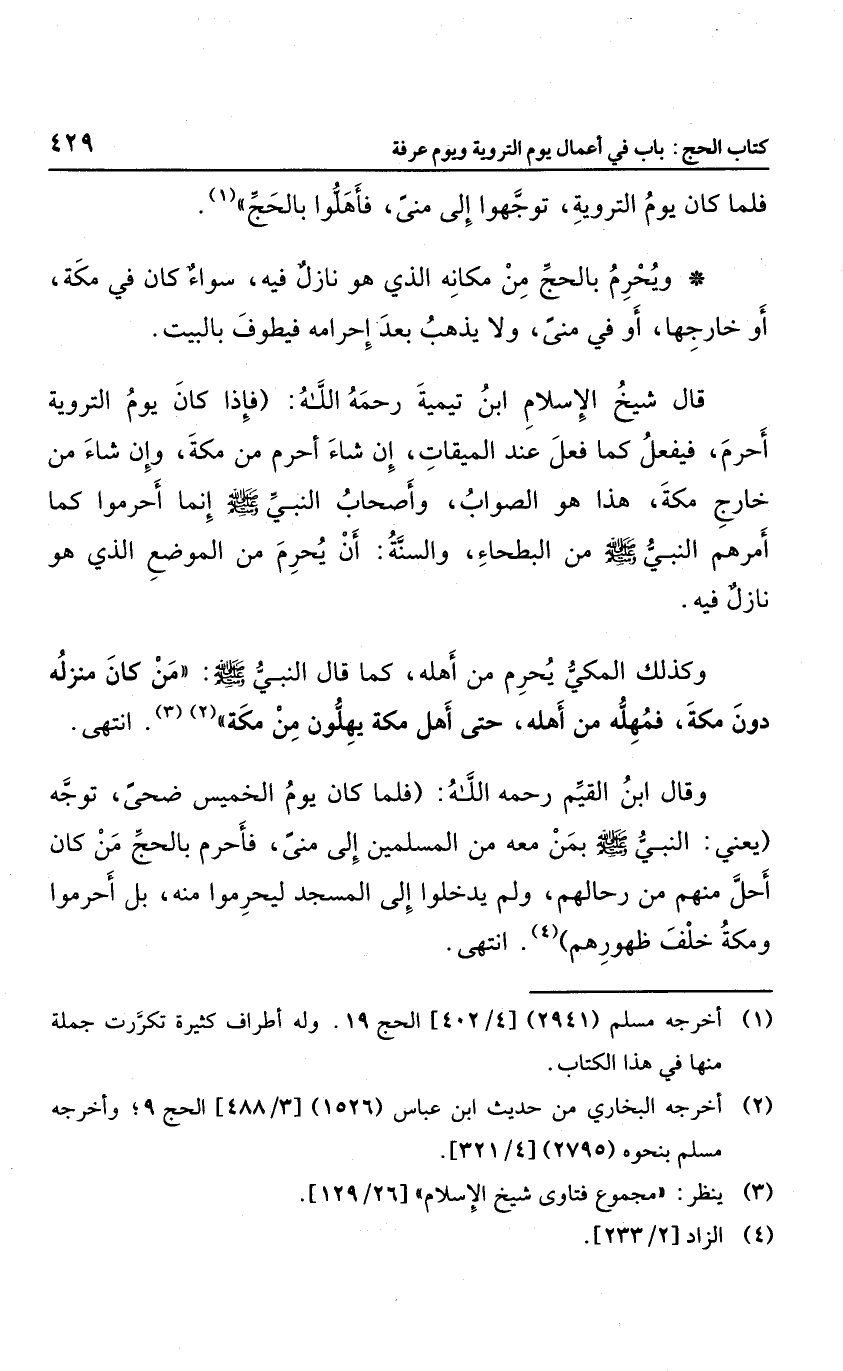 قال شيخ الإسلام ابن تيمية رحمه الله: "فإذا كان يوم التروية أحرم، فيفعل كما فعل عند الميقات؛ إن شاء أحرم من مكة، وإن شاء من خارج مكة، هذا هو الصواب، وأصحاب النبي صلى الله عليه وسلم إنما أحرموا كما أمرهم النبي صلى الله عليه وسلم من البطحاء، والسنة أن يحرم من الموضع الذي هو نازل فيه، وكذلك المكي يحرم من أهله؛ كما قال النبي صلى الله عليه وسلم: "من كان منزله دون مكة؛ فمهله من أهله، حتى أهل مكة يهلون من مكة" انتهى.