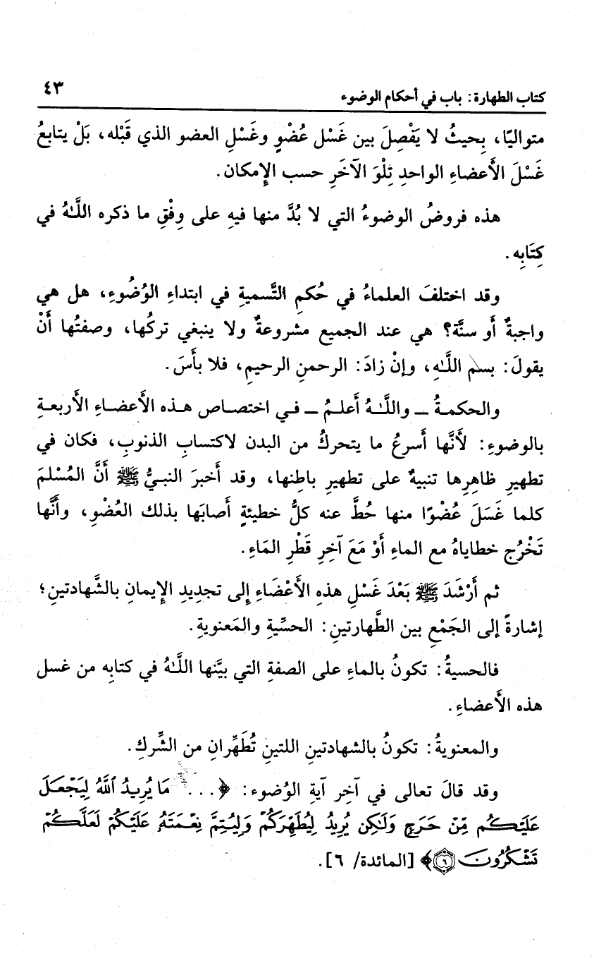 وقد قال تعالى في آخر آية الوضوء: {مَا يُرِيدُ اللَّهُ لِيَجْعَلَ عَلَيْكُمْ مِنْ حَرَجٍ وَلَكِنْ يُرِيدُ لِيُطَهِّرَكُمْ وَلِيُتِمَّ نِعْمَتَهُ عَلَيْكُمْ لَعَلَّكُمْ تَشْكُرُونَ} .