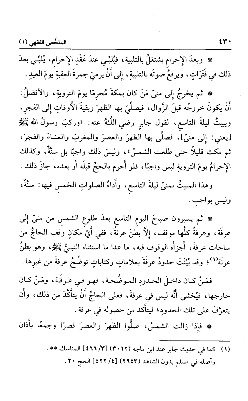 ثم يخرج إلى منى من كان بمكة محرما يوم التروية، والأفضل أن يكون خروجه قبل الزوال، فيصلي بها الظهر وبقية الأوقات إلى الفجر، ويبيت ليلة التاسع؛ لقول جابر رضي الله عنه: "وركب النبي صلى الله عليه وسلم إلى منى، فصلى بها الظهر والعصر والمغرب والعشاء والفجر، ثم مكث قليلاً حتى طلعت الشمس"، وليس ذلك واجبا بل سنة، وكذلك الإحرام يوم التروية ليس واجبا، فلو أحرم بالحج قبله أو بعده؛ جاز ذلك.