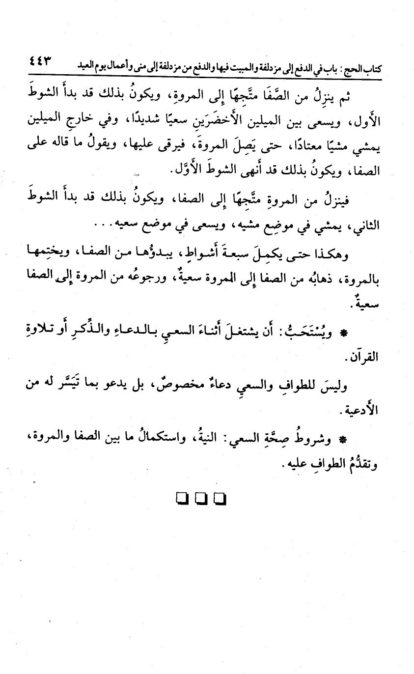 ثم ينزل من الصفا متجها إلى المروة، ويكون بذلك قد بدأ الشوط الأول، ويسعى بين الميلين الأخضرين سعيا شديدًا، وفي خارج الميلين يمشي مشيا معتادًا، حتى يصل المروة، فيرقى عليها، ويقول ما قاله على الصفا، ويكون بذلك قد أنهى الشوط الأول، فينزل من المروة متجها إلى الصفا، ويكون بذلك قد بدأ الشوط الثاني؛ يمشي في موضع مشيه، ويسعى في موضع سعيه ... وهكذا حتى يكمل سبعة أشواط؛ يبدؤها من الصفا، ويختمها بالمروة، ذهابه من الصفا إلى المروة سعية، ورجوعه من المروة إلى الصفا سعيه.