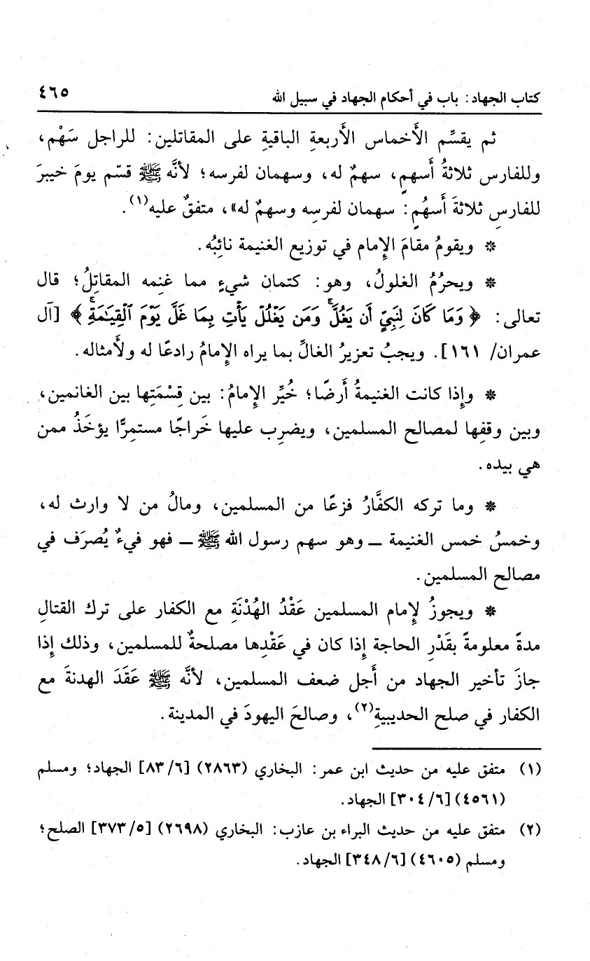 ثم يقسم الأخماس الأربعة الباقية على المقاتلين؛ للراجل سهم، وللفارس ثلاثة أسهم، سهم له، وسهمان لفرسه؛ لأنه صلى الله عليه وسلم أسهم يوم خيبر للفارس ثلاثة أسهم: سهمان لفرسه، وسهم له، متفق عليه.