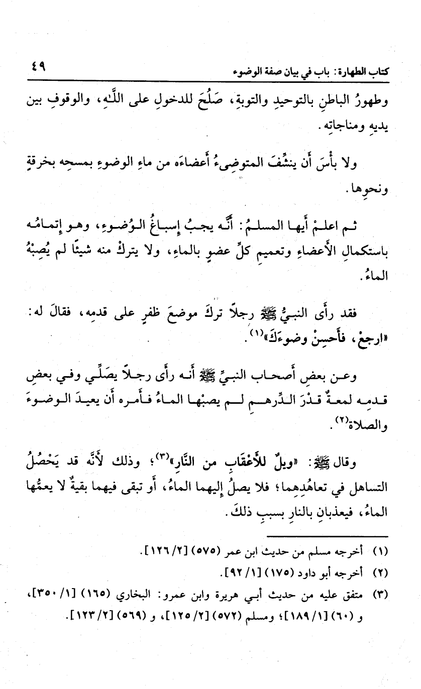 وعن بعض أزواج النبي صلى الله عليه وسلم؛ أنه رأى رجلاً يصلي وفي بعض قدمه لمعة قدر الدرهم لم يصبها الماء؛ فأمره أن يعيد الوضوء والصلاة، وقال صلى الله عليه وسلم: "ويل للأعقاب من النار" أو تبقى فيهما بقية لا يعمها الماء؛ فيعذبان بالنار بسبب ذلك.