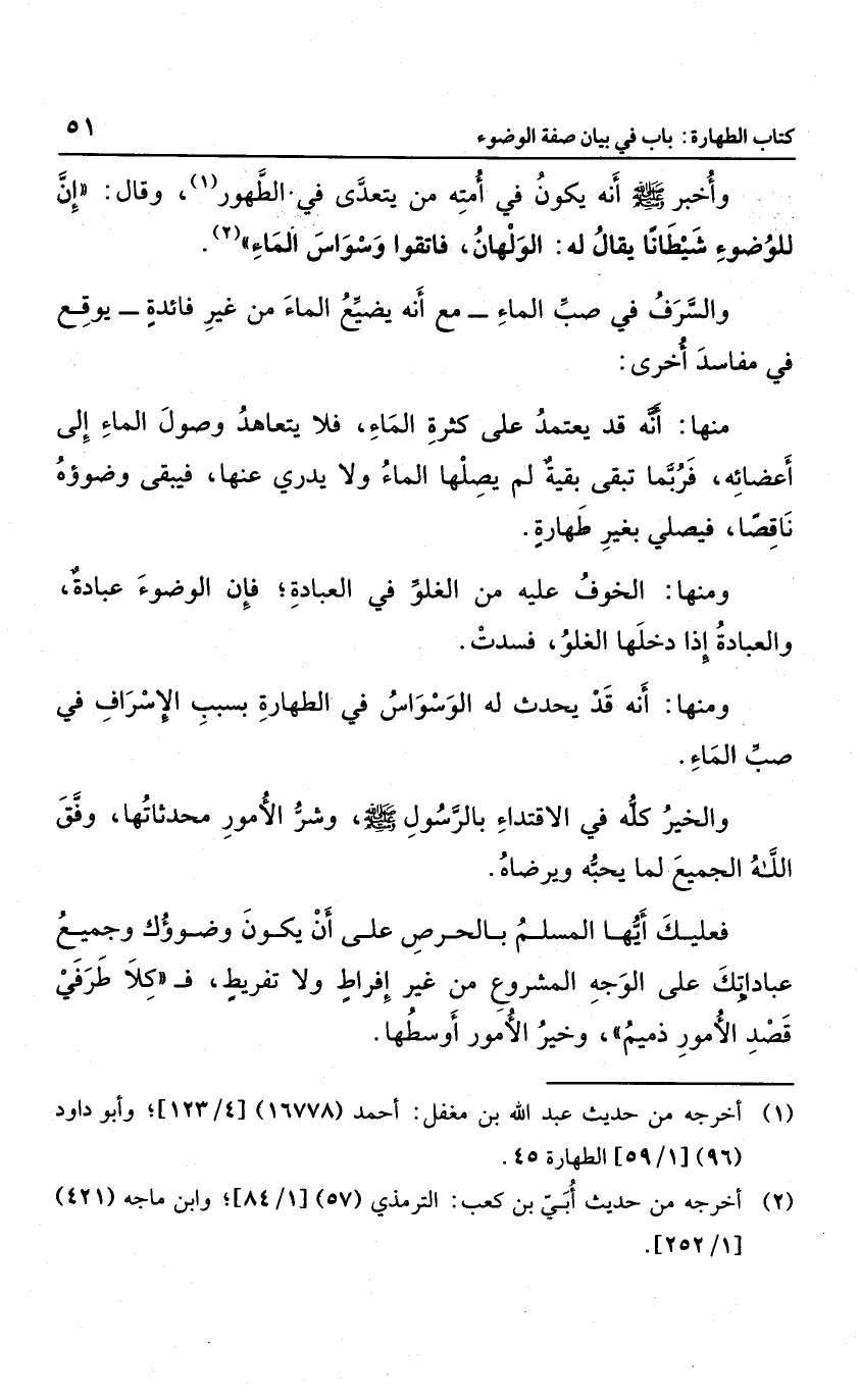 واخبر صلى الله عليه وسلم أنه يكون في أمته من يتعدى في الطهور، وقال: "إن للوضوء شيطانا يقال له: الولهان؛ فاتقوا وسواس الماء".