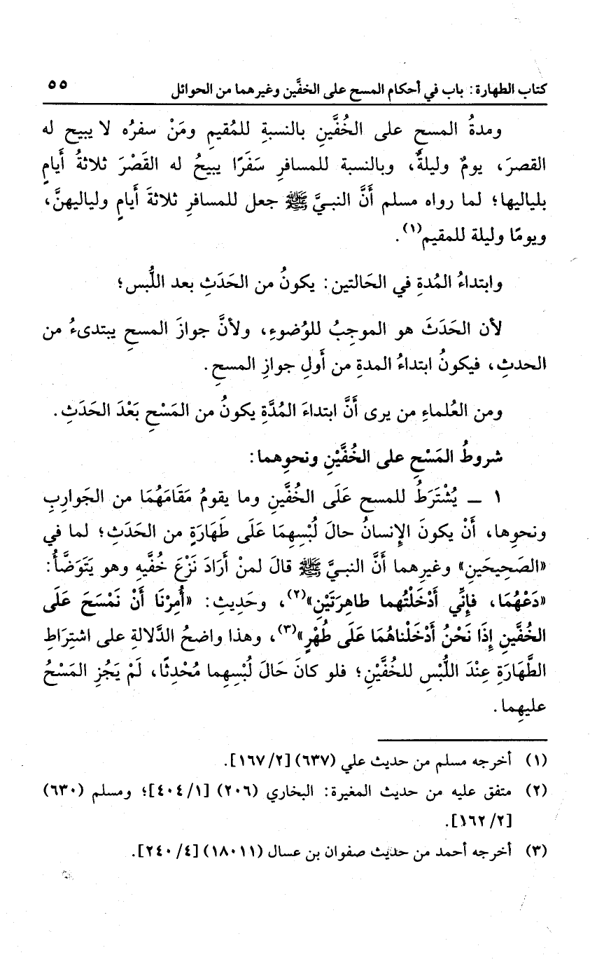 1 يشترط للمسح على الخفين وما يقوم مقامها من الجوارب ونحوها أن يكون الإنسان حال لبسهما على طهارة من الحدث؛ لما في الصحيحين وغيرهما؛ أن النبي صلى الله عليه وسلم قال لمن أراد نزع خفيه وهو يتوضأ: "دعهما؛ فإني أدخلتهما طاهرتين"، وحديث: "أمرنا أن نمسح على الخفين إذا نحن أدخلنا هما على طهر"، وهذا واضح الدلالة على اشتراط الطهارة عند اللبس للخفين، فلو كنا حال لبسهما محدثا؛ لم يجز المسح عليهما.
