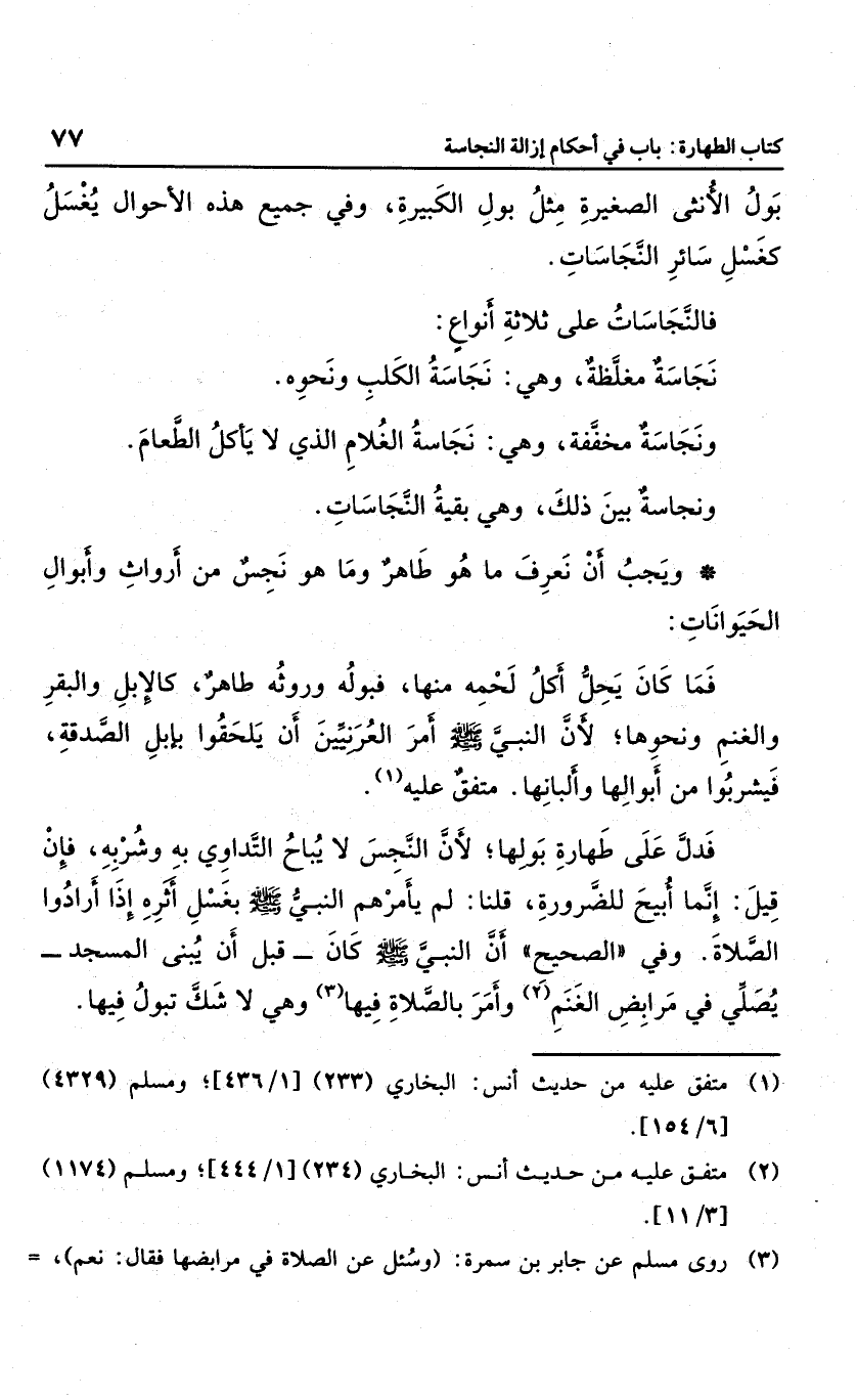 ويجب أن نعرف ما هو طاهر وما هو نجس من أرواث وأبوال الحيوانات: فما كان يحل أكل لحمه منها؛ فبوله وروثه طاهر؛ كالإبل والبقر والغنم ونحوها؛ لأن النبي صلى الله عليه وسلم أمر العرنين أن يلحقوا بإبل الصدقة، فيشربوا من أبوالها وألبانها. متفق عليه. فدل عليه طهارة بولها؛ لأن النجس لايباح التداوي به وشربه، فإن قيل: إنما أبيح للضرورة؛ قلنا: لم يأمرهم النبي صلى الله عليه وسلم بغسل أثره إذا أرادوا الصلاة. وفي "الصحيح": أن النبي صلى الله عليه وسلم كان يصلي في مرابض الغنم وأمر بالصلاة فيها وهي لا شك تبول فيها.