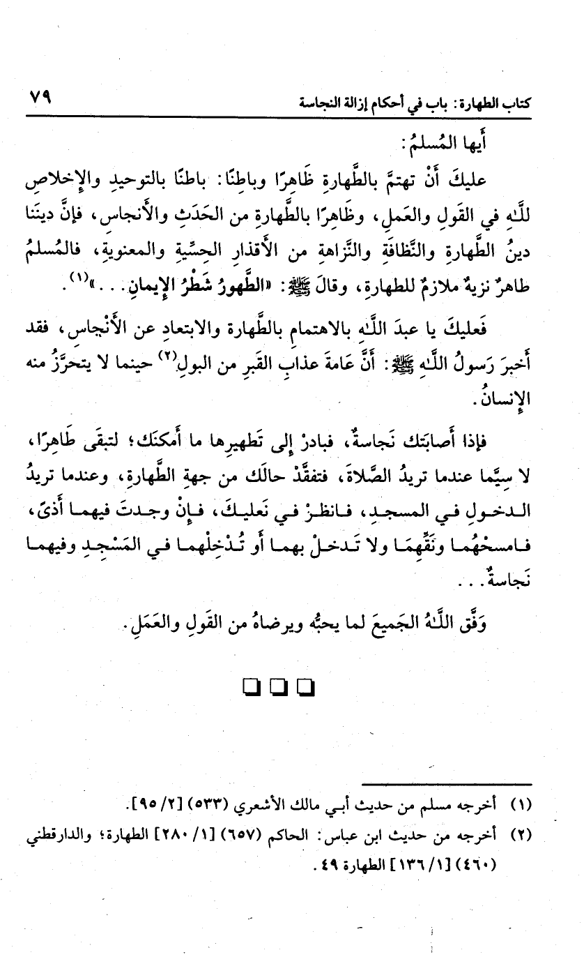 عليك أن تهتم بالطهارة ظاهراً وباطنا: باطنا بالتوحيد والإخلاص لله في القول والعمل، وظاهراً بالطهارة من الحدث والأنجاس؛ فإن ديننا دين الطهارة والنظافة والنزاهة من الأقذار الحسية والمعنوية؛ فالمسلم طاهر نزيه ملازم للطهارة، وقال صلى الله عليه وسلم: "الطهور شطر الإيمان ... ".