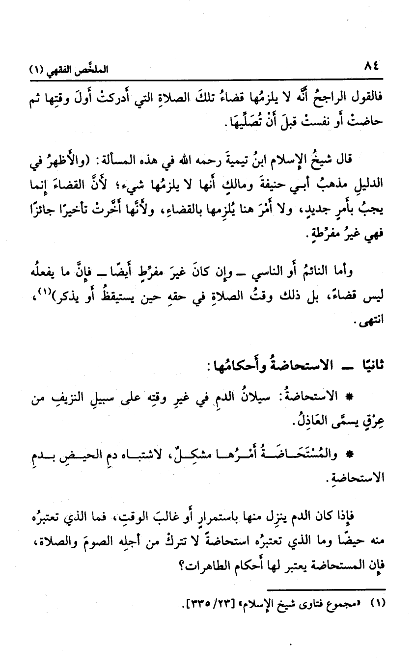 قال شيخ الإسلام ابن تيميه رحمه الله في "مجموع الفتاوي" "23/ 335" في هذه المسألة: "والأظهر في الدليل مذهب أبي حنيفة ومالك؛ أنها لا يلزمها شيء؛ لأن القضاء إنما يجب بأمر جديد، ولا أمر هنا يلزمها بالقضاء، ولأنها أخرت تأخيراً جائزاً؛ فهي غير مفرطة، وأما النائم أو الناسي؛ وإن كان غير مفرط أيضا؛ فإن ما يفعله ليس قضاء، بل ذلك وقت الصلاة في حقه حين يستيقظ ويذكر" انتهى.