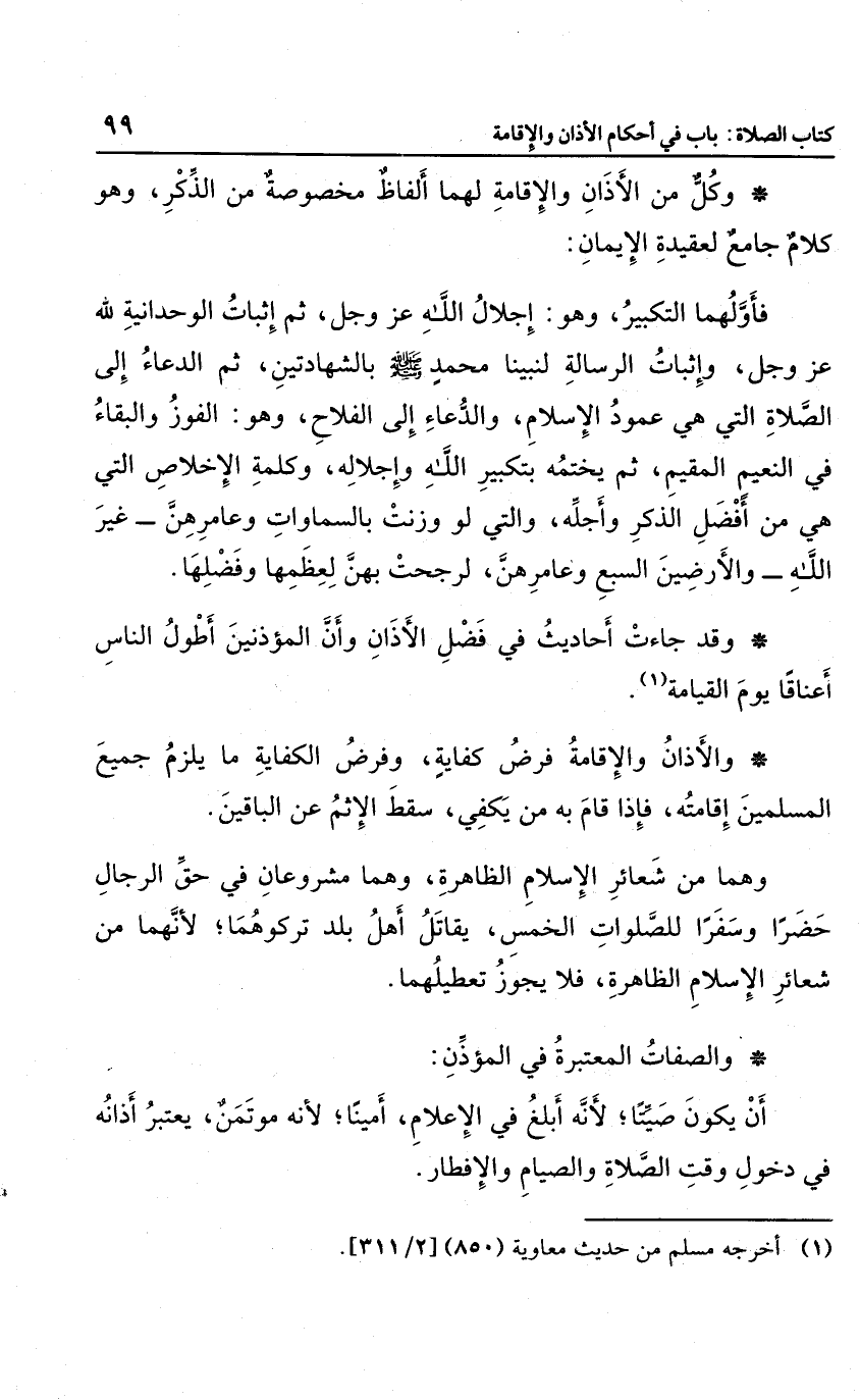 وكل من الأذان والإقامة لهما ألفاظ مخصوصة من الذكر، وهو كلام جامع لعقيدة الإيمان؛ فأولهما التكبير، وهو إجلال الله عز وجل، ثم إثبات الوحدانية لله عز وجل، وإثبات الرسالة لنبينا محمد بالشهادتين، ثم الدعاء إلى الصلاة التي هي عمود الإسلام، والدعاء إلى الفلاح، وهو الفوز والبقاء في النعيم المقيم، ثم يختمه بتكبير الله وإجلاله وكلمة الإخلاص التي هي من أفضل الذكر وأجله، والتي لو وزنت بالسماوات وعامرهن غير الله والأرضين السبع وعامرهن؛ لرجحت بهن لعظمها وفضلها.