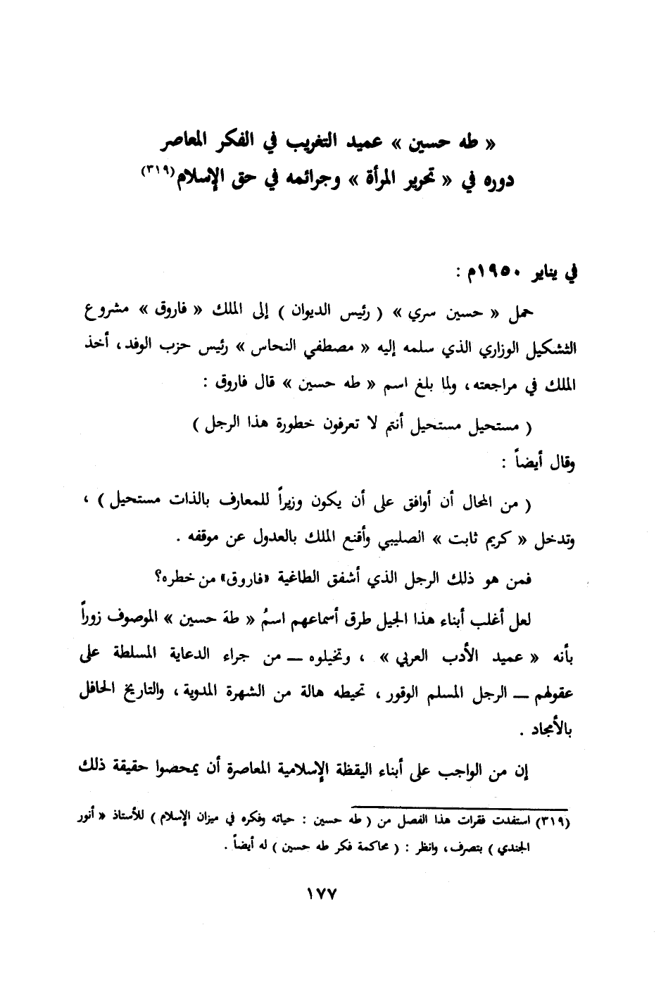 (319) استفدت فقرات هذا الفصل من (طه حسين: حياته وفكره في ميزان الإسلام) للأستاذ " أنور الجندي "