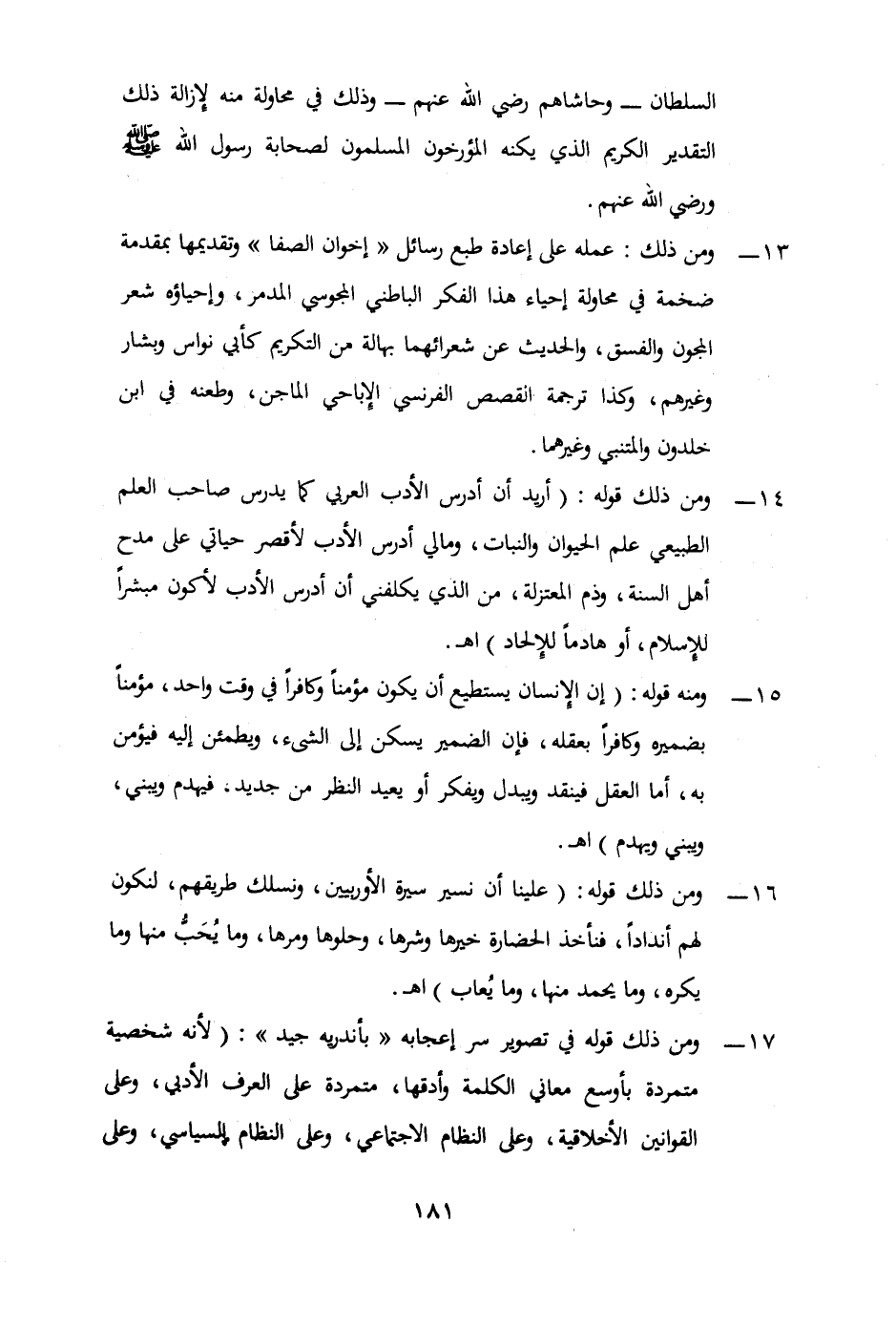 14 - ومن ذلك قوله: (أريد أن أدرس الأدب العربي كما يدرس صاحب العلم الطبيعي علم الحيوان والنبات ومالي أدرس الأدب لأقصر حياتي على مدح أهل السنة وذم المعتزلة من الذي يكلفني أن أدرس الأدب لأكون مبشراً للإسلام أو هادماً للإلحاد) اهـ.