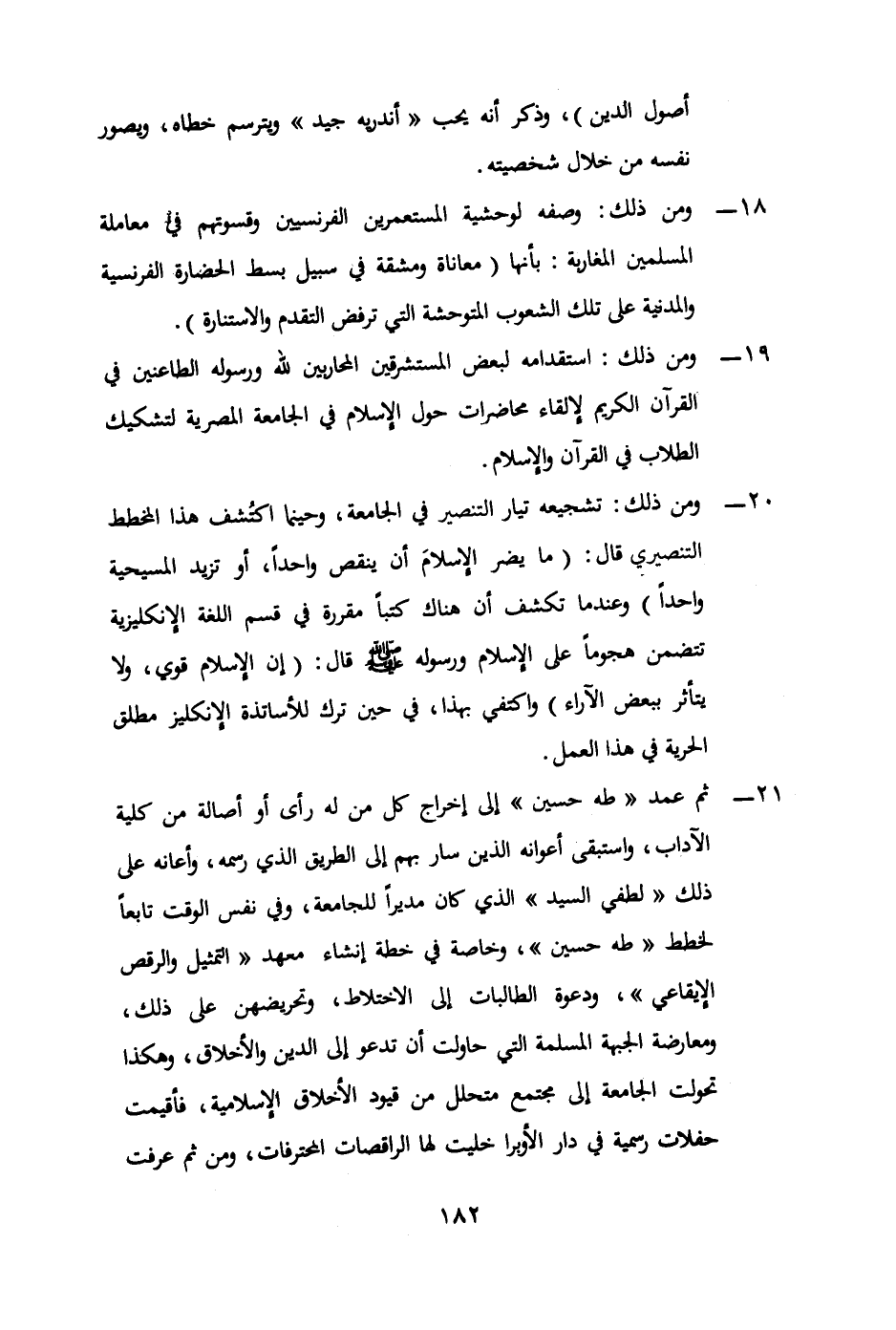 20 - ومن ذلك: تشجيعه تيار التنصير في الجامعة وحينما اكتشف هذا المخطط التنصيري قال: (ما يضر الإسلام أن ينقص واحداً أو تزيد المسيحية واحداً) وعندما تكشف أن هناك كتباً مقررة في قسم اللغة الإنكليزية تتضمن هجوماً على الإسلام ورسوله " قال: (إن الإسلام قوي ولا يتأثر ببعض الآراء) واكتفى بهذا في حين ترك للأساتذة الإنكليز مطلق الحرية في هذا العمل.