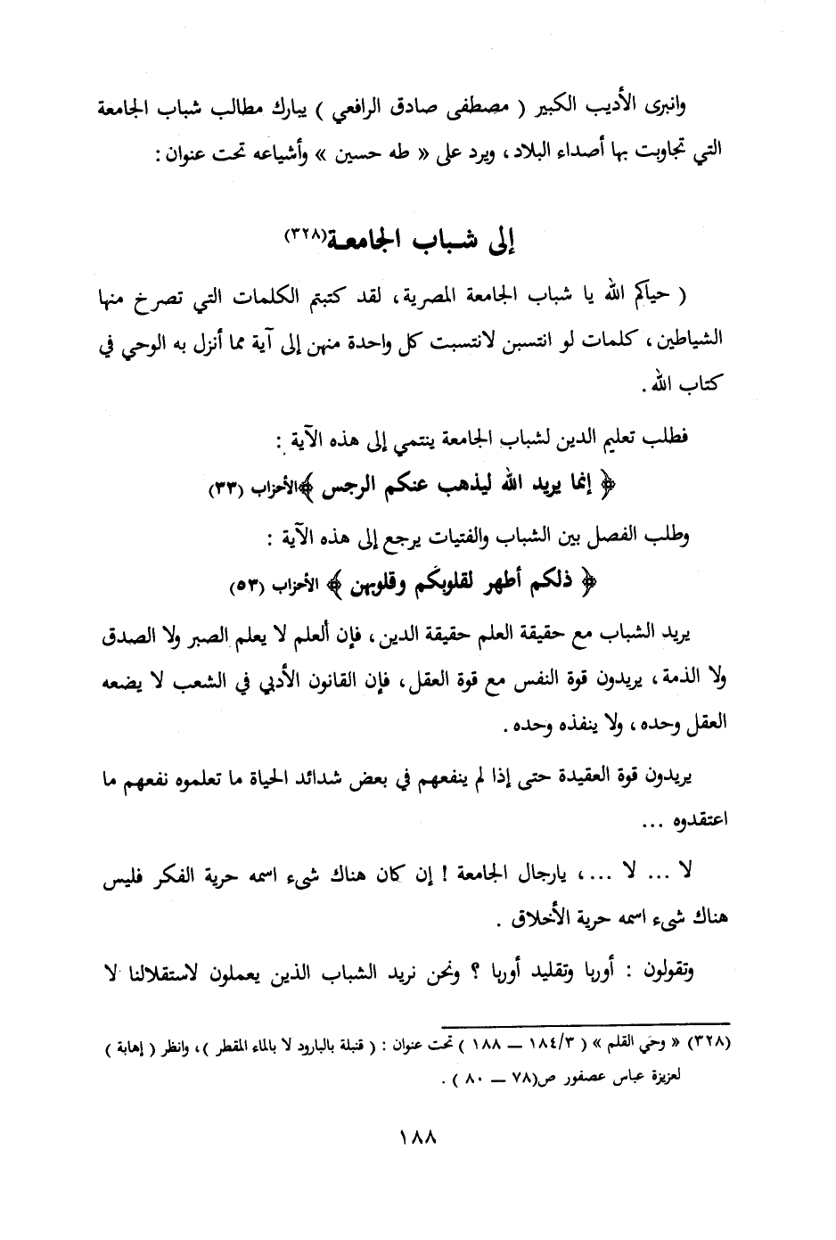 (328) " وحي القلم " (3 / 184 - 188) تحت عنوان (قنبلة بالبارود لا بالماء المقطر) ، وانظر " إهابة " لعزيزة عباس عصفور ص (78 - 80) .