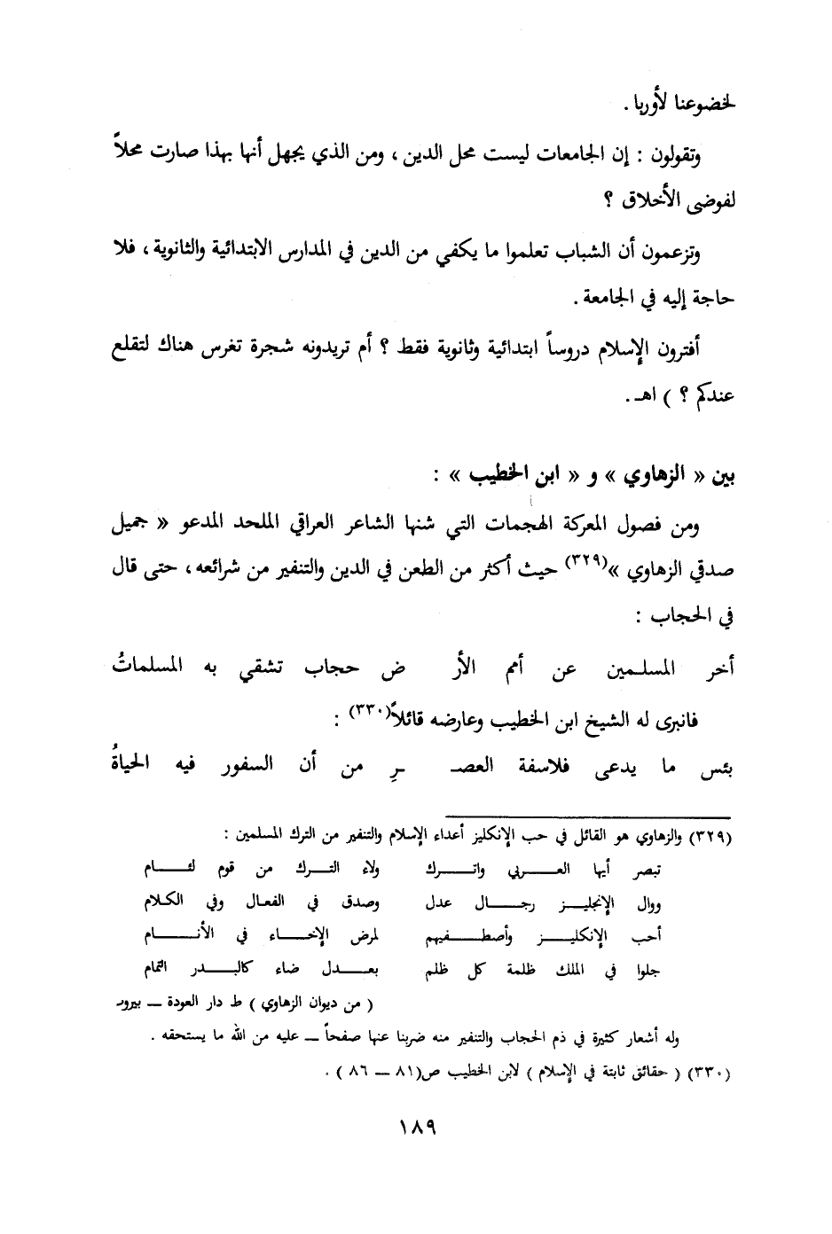 (من ديوان الزهاوي) ط دار الدعوة - بيروت وله أشعار كثيرة في ذم الحجاب والتنفير منه ضربنا عنها صفحاً - عليه من الله ما يستحقه.