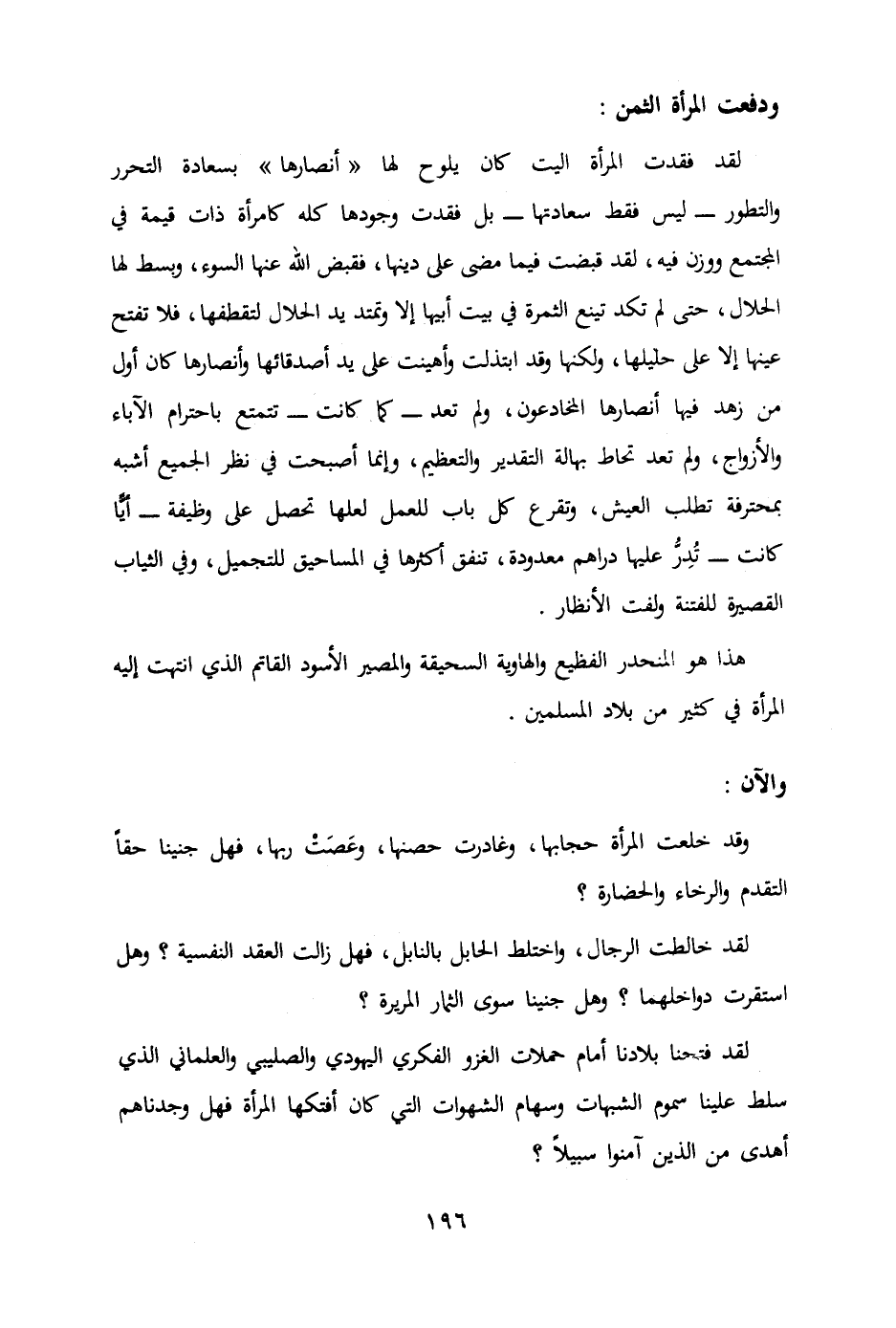 لقد فقدت المرأة التي كان يلوح لها " أنصارها " بسعادة التحرر والتطور - ليس فقط سعادتها - بل فقدت وجودها كله ذات قيمة في المجتمع ووزن فيه لقد قبضت فيما مضى على دينها فقبض الله عنها السوء وبسط لها الحلال حتى لم تكد تينع الثمرة في بيت أبيها إلا وتمتد يد الحلال وتقطفها فلا تفتح عينها إلا على حليلها ولكنها قد ابتذلت وأهينت على يد أصدقائها وأنصارها كان أول من زهد فيها أنصارها المخادعون ولم تعد - كما كانت - تتمتع باحترام الآباء والأزواج ولم تعد تحاط بهالة التقدير والتعظيم وإنما أصبحت في نظر الجميع أشبه بمحترفة تطلب العيش وتقرع كل باب للعمل لعلها تحصل على وظيفة - أي كانت - تدر عليها دراهم معدودة تنفق أكثرها في المساحيق للتجميل وفي الثياب القصيرة للفتنة ولفت الأنظار.