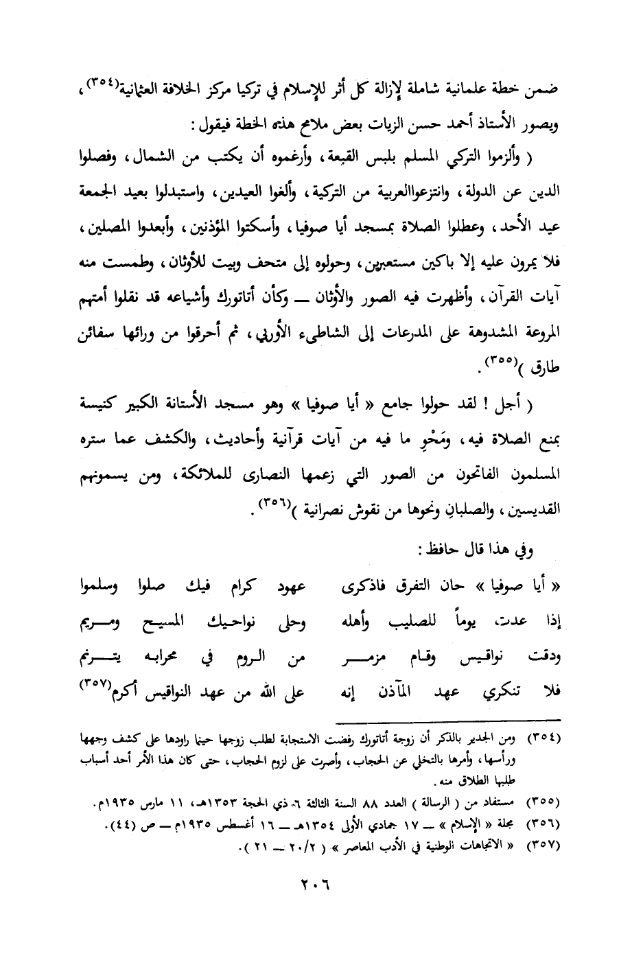 (وألزموا التركي المسلم بلبس القبعة وأرغموه أن يكتب من الشمال وفصلوا الدين عن الدولة وانتزعوا العربية من التركية وألغوا العيدين واستبدلوا بعيد الجمعة عيد الأحد وعطلوا الصلاة بمسجد أيا صوفيا وأسكتوا المؤذنين وأبعدوا المصلين فلا يمرون عليه إلا باكين مستعبرين وحولوه إلى متحف وبيت للأوثان وطمست منه آيات القرآن وأظهرت فيه الصور والأوثان - وكأن أتاتورك وأشياعه قد نقلوا أمتهم المروعة المشدوهةعلى المدرعات إلى الشاطئ الأوربي ثم أحرقوامن ورائها سفائن طارق) (355)
