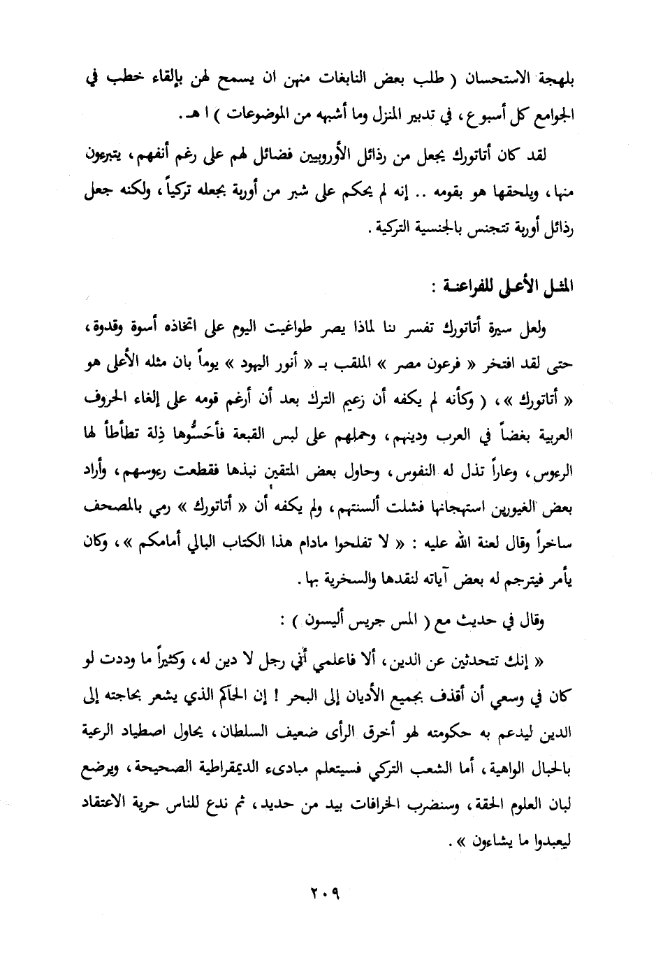 لقد كان أتاتورك يجعل من رذائل الأوربيين فضائل لهم على رغم أنفهم يتبرءون منها ويلحقها هو بقومه.. إنه لم يحكم على شبر من أوربا بجعله تركيا ولكنه جعل رذائل أوربة تتجنس بالجنسية التركية.