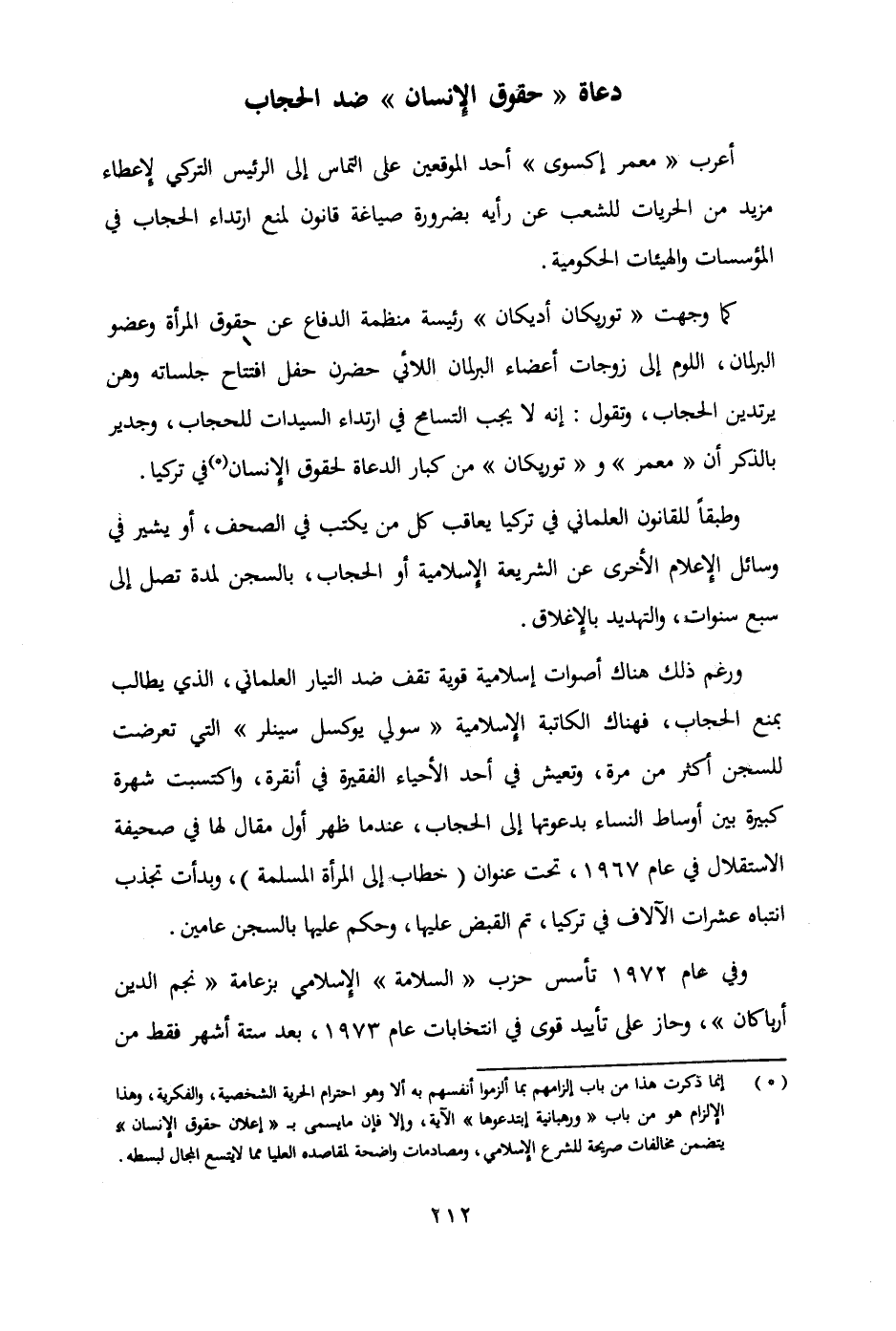 وطبقاً للقانون العلماني في تركيا يعاقب كل من يكتب في الصحف أو يشير في وسائل الإعلام الأخرى عن الشريعة الإسلامية أو الحجاب بالسجن لمدة تصل إلى سبع سنوات والتهديد بالإغلاق.
