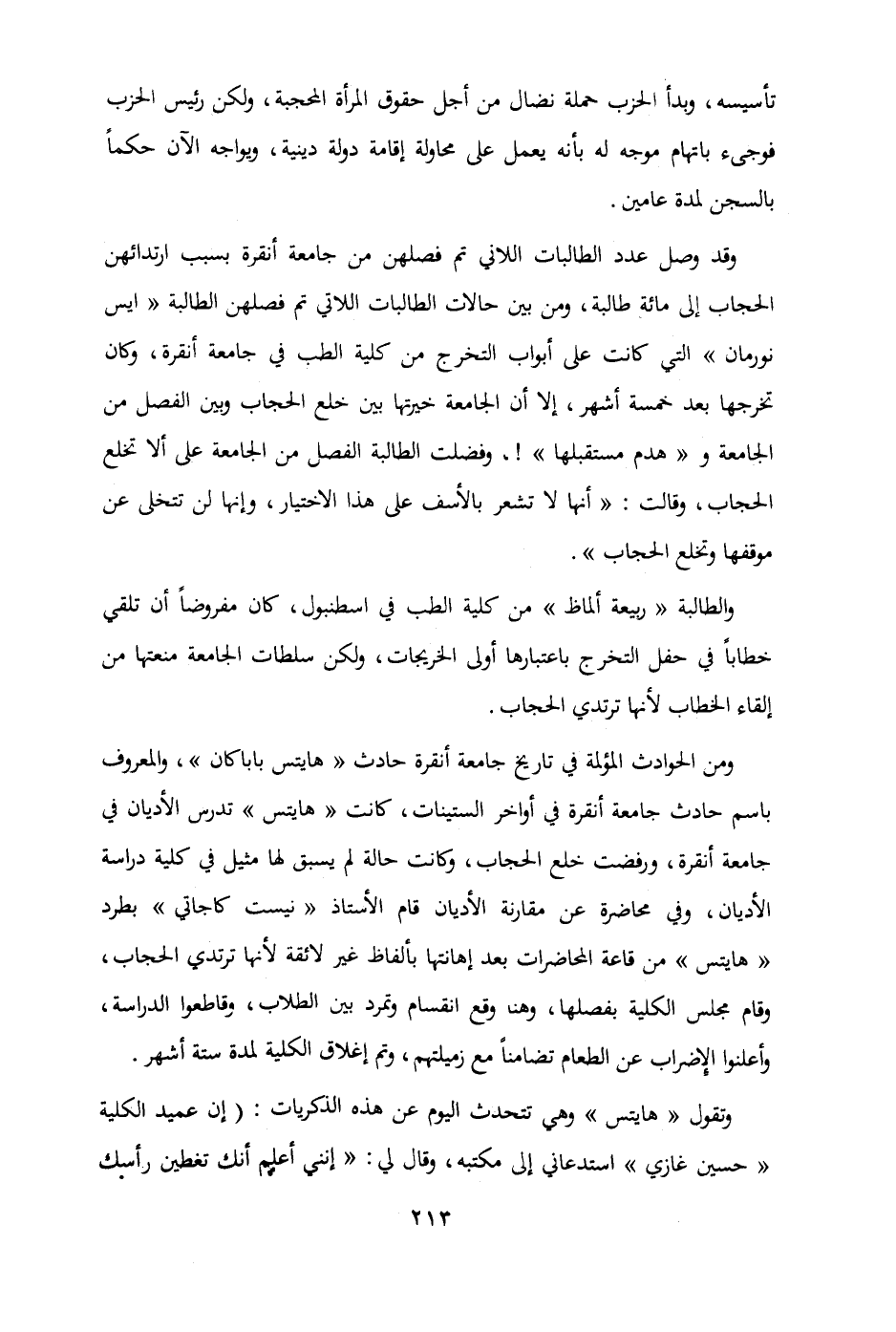 ومن الحوادث المؤلمة في تاريخ جامعة لنقرة حادث " هايتس بابا كان " والمعروف باسم حادث جامعة أنقرة في أواخر الستينات كانت " هايتس " تدرس الأديان في جامعة أنقرة ورفضت خلع الحجاب وكانت حالة لم يسبق لها مثيل في كلية دراسة الأديان وفي محاضرة عن مقارنة الأديان قام الأستاذ " نيست كاجاتي " بطرد " هايتس " من قاعة المحاضرات بعد إهانتها بألفاظ غير لائقة لأنها ترتدي الحجاب وقام مجلس الكلية بفصلها وهنا وقع انقسام وتمرد بين الطلاب وقاطعوا الدراسة وأعلنوا الإضراب عن الطعام تضامن مع زميلتهم وتم إغلاق الكلية لمدة ستة أشهر وتقول " هايتس " وهي تتحدث اليوم عن هذه الذكريات: