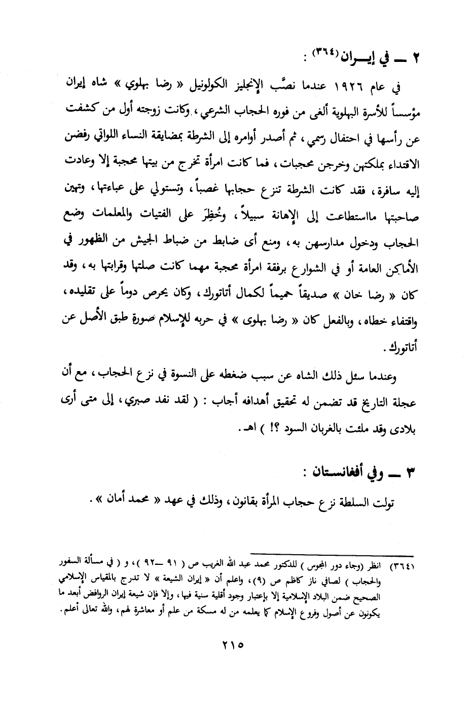 (364) انظر (وجاء دور المجوس) للدكتور محمد عبد الله الغريب ص (91 - 92) ، و (في مسألة السفور والحجاب) لصافي ناز كاظم ص (9) واعلم أن " إيران الشيعة " لا تدرج بالمقياس الإسلامي الصحيح ضمن البلاد الإسلامية إلا باعتبار وجود أقلية سنية فيها أو عوام جهلة لم تقم عليهم الحجة وإلا فإن شيعة إيران الروافض أبعد ما يكونون عن أصول وفروع الإسلام كما يعلمه من له مسكة من علم أو معاشرة لهم والله تعالى أعلم.
