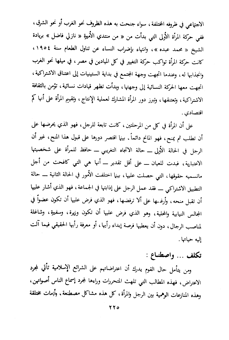 على أن المرأة في كل من المرحلتين كانت تابعة للرجل فهو الذي يحرضها على أن تطلب ثم يمنح فهو المانح دائماً بينما اقتصر دورها على قبول هذا المنح غير أن الرجل في الحالة الأولى - حالة الاتجاه التغريبي - حافظ للمرأة على شخصيتها الاعتبارية فبدت للعيان - على أقل تقدير - أنها هي التي كافحت من أجل ما تسميه حقوقها التي حصلت عليها بينما اختلفت الأمور في الحالة الثانية - حالة التطبيق الاشتراكي - فقد عمل الرجل على إذابتها في الجماعة فهو الذي أشار عليها أن تقبل منحه وأرغمها على ألا ترفضه فهو الذي فرض عليها ان تكون عضواً في المجالس النيابية والمحلية وهو الذي فرض عليها أن تكون وزيرة وسفيرة وشاغلة لمناصب الرجال دون أن يعطيها فرصة إبداء رأيها أو معرفة رأيها الحقيقي فيما آلت إليه حياتها) اهـ.