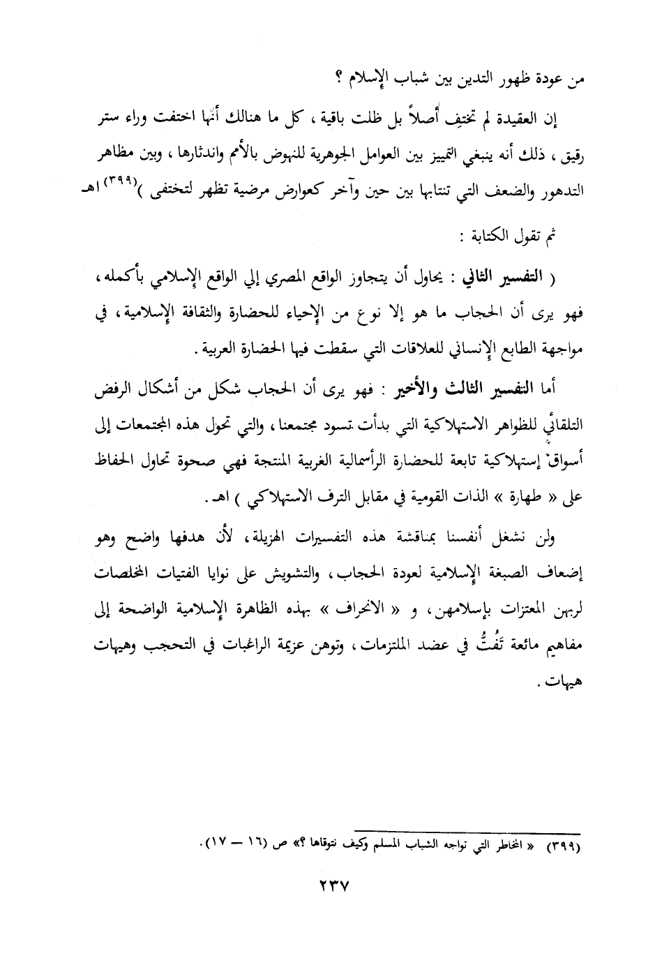 من عودة ظهور التدين بين شباب الإسلام؟ إن العقيدة لم تختف أصلاً بل ظلت باقية كل ما هنالك أنها اختفت وراء ستر رقيق ذلك أنه ينبغي التمييز بين العوامل الجوهرية للنهوض بالأمم واندثارها وبين مظاهر التدهور والضعف التي تنتابها بين حين وآخر كعوارض مرضية تظهر لتختفي) (399) اهـ.