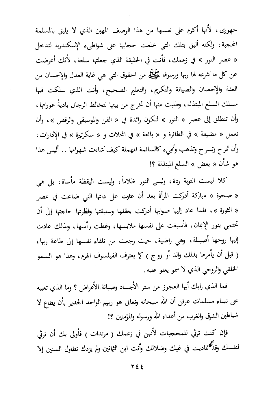 جهوري لأنها أكرم على نفسها من هذا الوصف المهين الذي لا يليق بالمسلمة المحجبة ولكنه أليق بتلك التي خلعت حجابها على شواطئ الإسكندرية لتدخل " عصر النور " في زعمك فأنت في الحقيقة الذي جعلتها سلعة لأنك أعرضت عن كل ما شرعه لها ربه ورسولها صلى الله عليه وسلم من الحقوق التي هي في غاية العدل والإحسان من العفة والإحصان والصيانة والتكريم والتعليم الصحيح وأنت الذي سلكت فيها مسلك السلع المبتذلة وطلبت منها أن تخرج من بيتها لتخالط الرجال بادية عوراتها وأن تنطلق إلى عصر " النور " لتكون رائدة في " الفن والموسيقى والرقص " وأن تعمل " مضيفة في الطائرة وبائعة في المحلات وسكرتيرة في الإدارات وأن تمرح وتسرح وتذهب وتجئ كالسائمة المهملة كيف شاءت شهواتها.. أليس هذا هو شأن " بعض " السلع المبتذلة؟!
