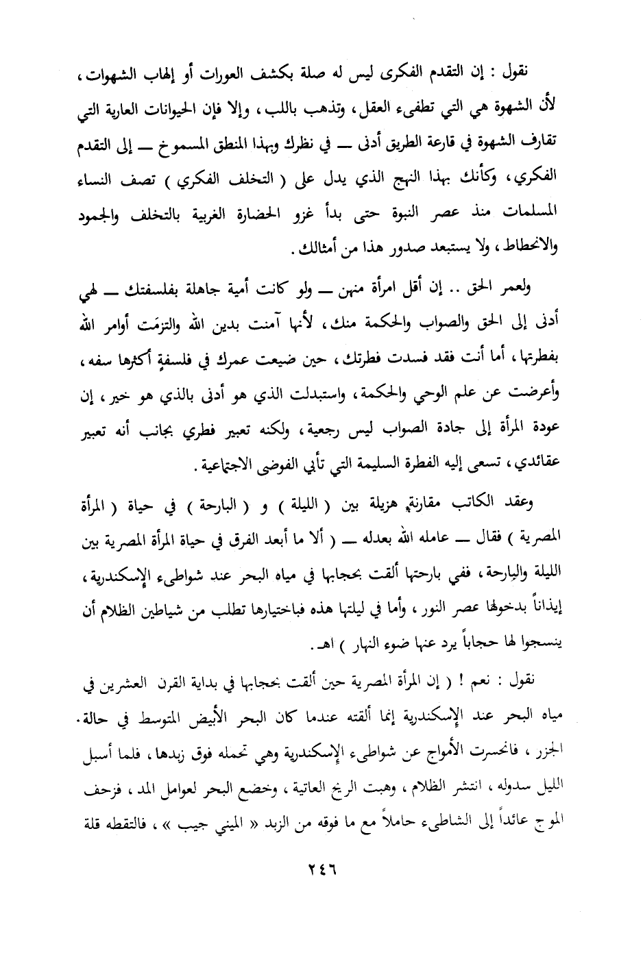 ولعمر الحق.. إن أقل امرأة منهن - ولو كانت أمية جاهلة بفلسفتك - لهي أدنى إلى الحق والصواب والحكمة منك لأنها آمنت بدين الله والتزمت أوامر الله بفطرتها أما أنت فقد فسدت فطرتك حين ضيعت عمرك في فلسفة أكثرها سفه وأعرضت عن علم الوحي والحكمة واستبدلت الذي هو أدنى بالذي هو خير إن عودة المرأة إلى جادة الصواب ليس رجعية ولكنه تعبير فطري بجانب أنه تعبير عقائدي تسعى إليه الفطرة السليمة التي تأبى الفوضى الاجتماعية.