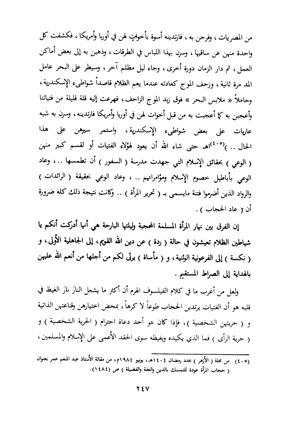 (405) من مجلة الأزهر عدد رمضان 1404 هـ يونيو 1984 م من مقالة الأستاذ عبد المنعم عمر بعنوان (حجاب المرأة عودة للتمسك بالدين والعفة والفضيلة) ص (1484) .