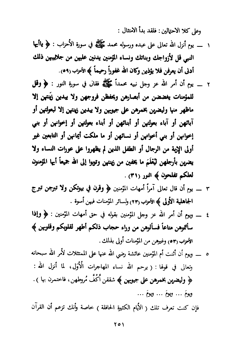 3 - يوم أن قال تعالى آمراً أمهات المؤمنين: (وقرن في بيوتكن ولا تبرجن تبرج الجاهلية الأولى) الأحزاب (23) ولسائر المؤمنات فيهن أسوة.