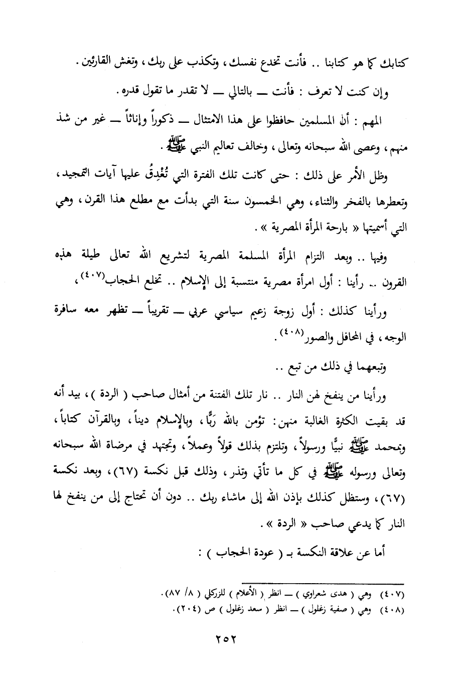 ورأينا من ينفخ لهن النار..نار تلك الفتنة من أمثال صاحب (الردة) بيد أنه قد بقيت الكثرة الغالبة منهن: تؤمن بالله رباً وبالإسلام ديناً وبالقرآن كتاباً وبمحمد - صلى الله عليه وسلم - نبياً ورسولاً في كل ما تأتي وتذر وذلك قبل نكسة (67) وبعد نكسة (67) وستظل كذلك بإذن الله إلى ما شاء ربك..دون أن تحتاج إلى من ينفخ لها النار كما يدعي صاحب