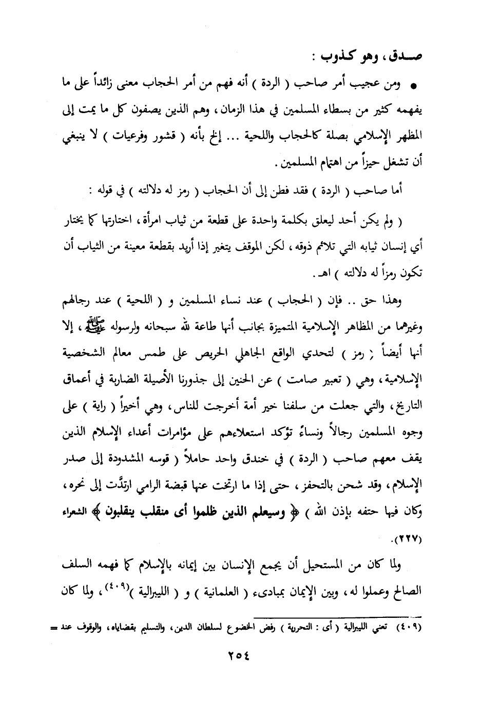 ولما كان من المستحيل أن يجمع الإنسان بين إيمانه بالإسلام كما فهمه السلف الصالح وعملوا له وبين الإيمان بمبادئ " العلمانية " و " الليبرالية " (409) ولما كان