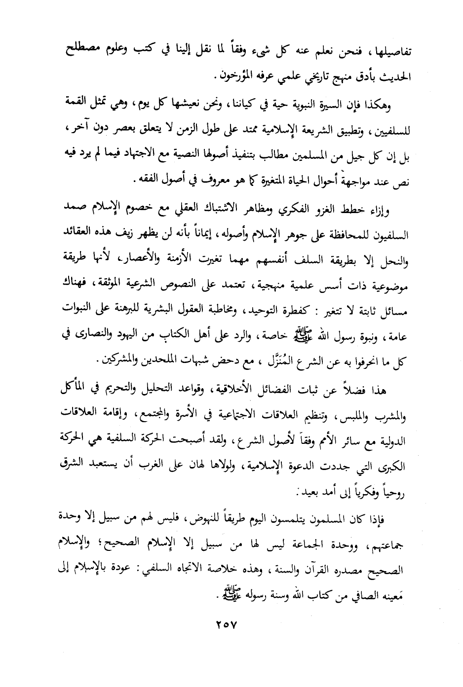 وإزاء خطط الغزو الفكري ومظاهر الاشتباك العقلي مع خصوم الإسلام صمد السلفيون للمحافظة على جوهر الإسلام وأصوله إيماناً بأنه لم يظهر زيف هذه العقائد والنحل إلا بطريقة السلف أنفسهم مهما تغيرت الأزمنة والأعصار لأنها طريقة موضوعية ذات أسس عليمة منهجية تعتمد على النصوص الشرعية الموثقة فهناك مسائل ثابتة لا تتغير: كفطرة التوحيد ومخاطبة العقول البشرية للبرهنة على النبوات عامة ونبوة رسول الله صلى الله عليه وسلم خاصة والرد على أهل الكتاب من اليهود والنصارى في كل ما انحرفوا به عن الشرع المنزل مع دحض شبهات الملحدين والمشركين.