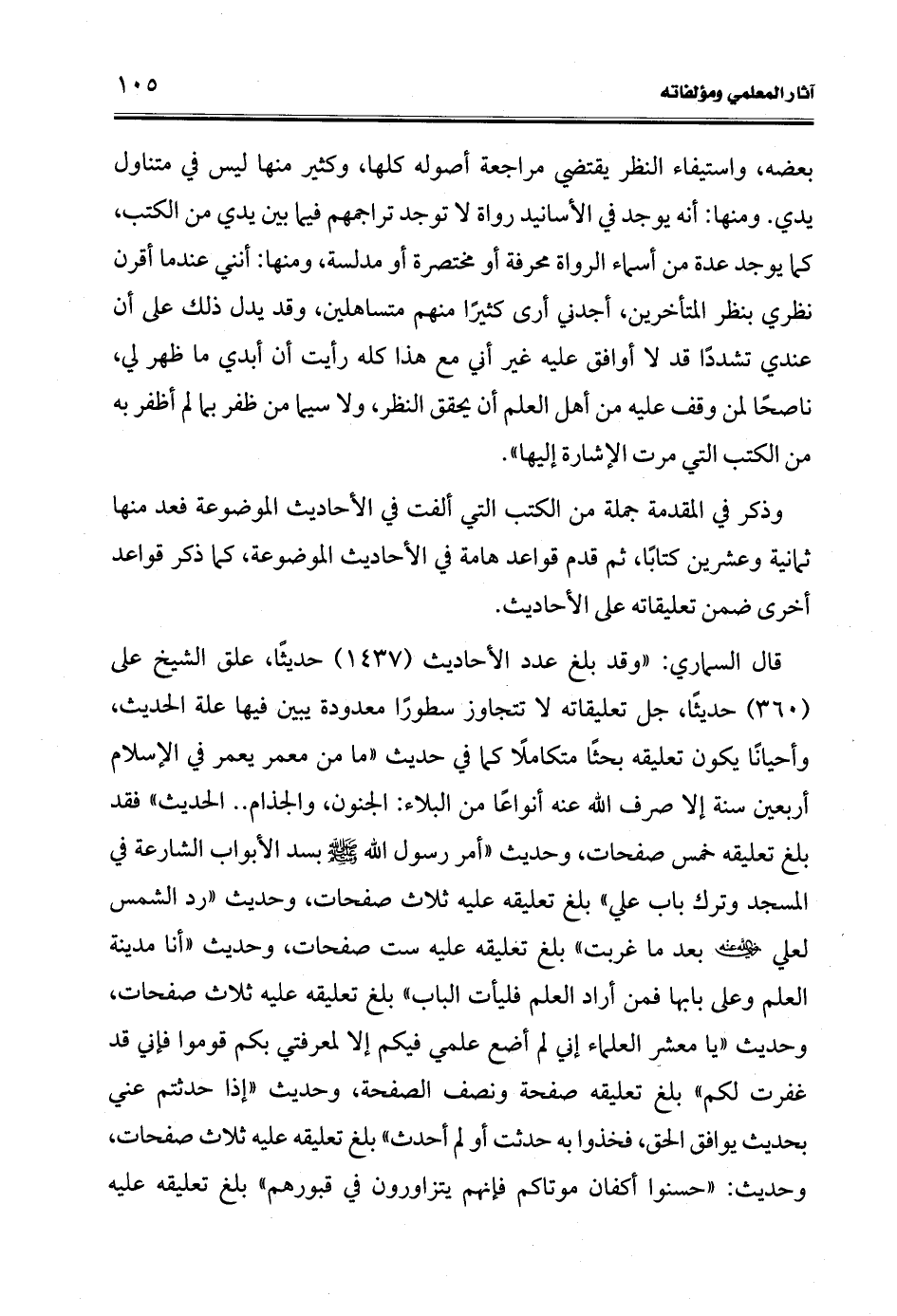 قال السماري: "وقد بلغ عدد الأحاديث (1437) حديثًا، علق الشيخ على (360) حديثًا، جل تعليقاته لا تتجاوز سطورًا معدودة يبين فيها علة الحديث، وأحيانًا يكون تعليقه بحثًا متكاملًا كما في حديث "ما من معمر يعمر في الإسلام أربعن سنة إلا صرف الله عنه أنواعًا من البلاء: الجنون، والجذام .. الحديث" فقد بلغ تعليقه خمس صفحات، وحديث "أمر رسول الله -صلى الله عليه وسلم- بسد الأبواب الشارعة في المسجد وترك باب علي" بلغ تعليقه عليه ثلاث صفحات، وحديث "رد الشمس لعلي -رضي الله عنه- بعد ما غربت" بلغ تعليقه عليه ست صفحات، وحديث "أنا مدينة العلم وعلي بابها فمن أراد العلم فليأت الباب" بلغ تعليقه عليه ثلاث صفحات، وحديث "يا معشر العلماء إني لم أضع علمي فيكم إلا لمعرفتي بكم قوموا فإني قد غفرت لكم" بلغ تعليقه صفحة ونصف الصفحة، وحديث "إذا حدثتم عني بحديث يوافق الحق، فخذوا به حدثت أو لم أحدث" بلغ تعليقه عليه ثلاث صفحات، وحديث: "حسنوا أكفان موتاكم فإنهم يتزاورون في قبورهم" بلغ تعليقه عليه