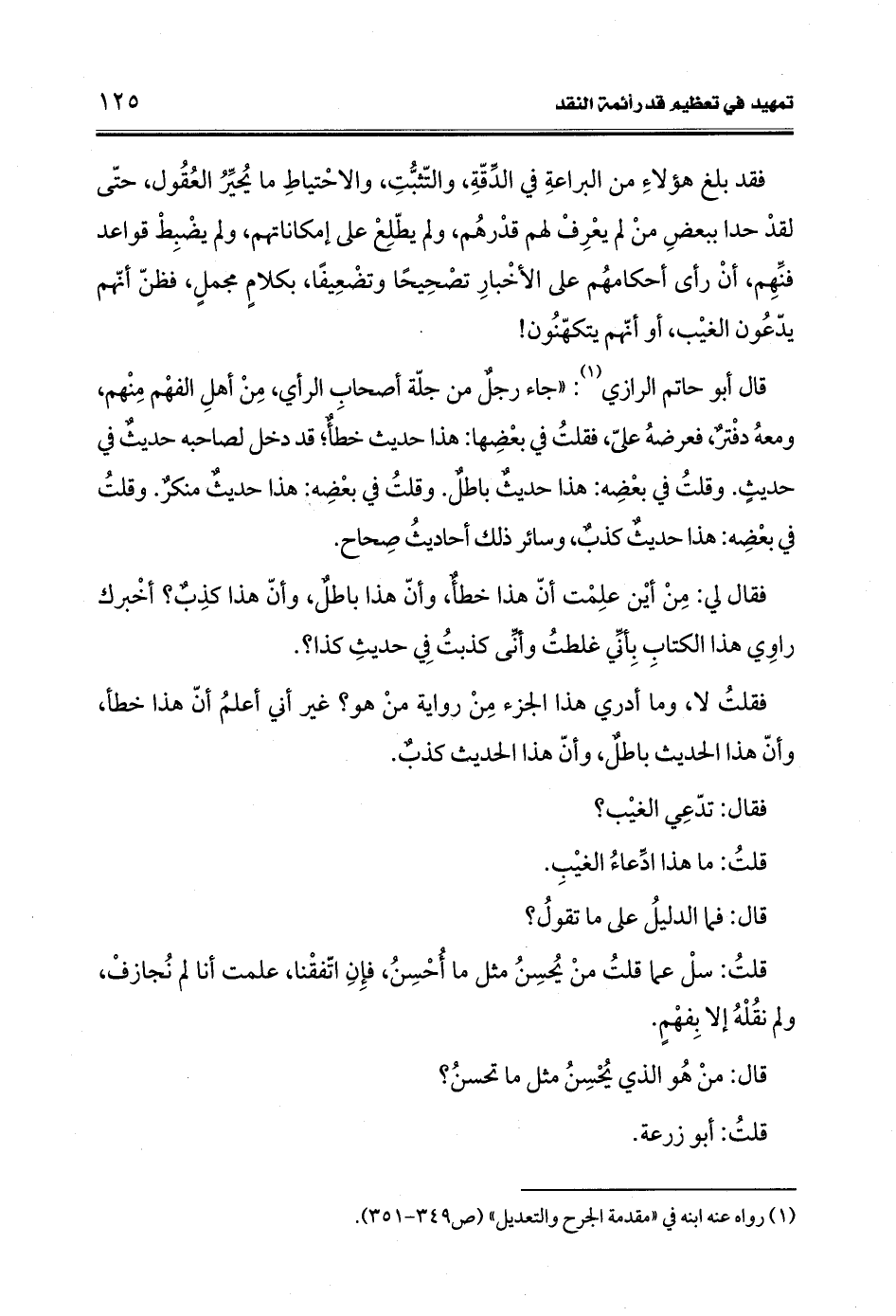 فقد بلغ هؤلاءِ من البراعةِ في الدّقّةِ، والتّثبُّتِ، والاحْتياطِ ما يُحِّيرُ العُقُول، حتى لقدْ حدا ببعضِ منْ لم يعْرِفْ لهم قدْرهُم، ولم يطّلِعْ على إمكاناتهم، ولم يضْبِطْ قواعد فنِّهِم، أنْ رأى أحكامهُم على الأخْبارِ تصْحِيحًا وتضْعِيفًا، بكلامٍ مجملٍ، فظنّ أنّهم يدّعُون الغيْب، أو أنّهم يتكهّنُون!