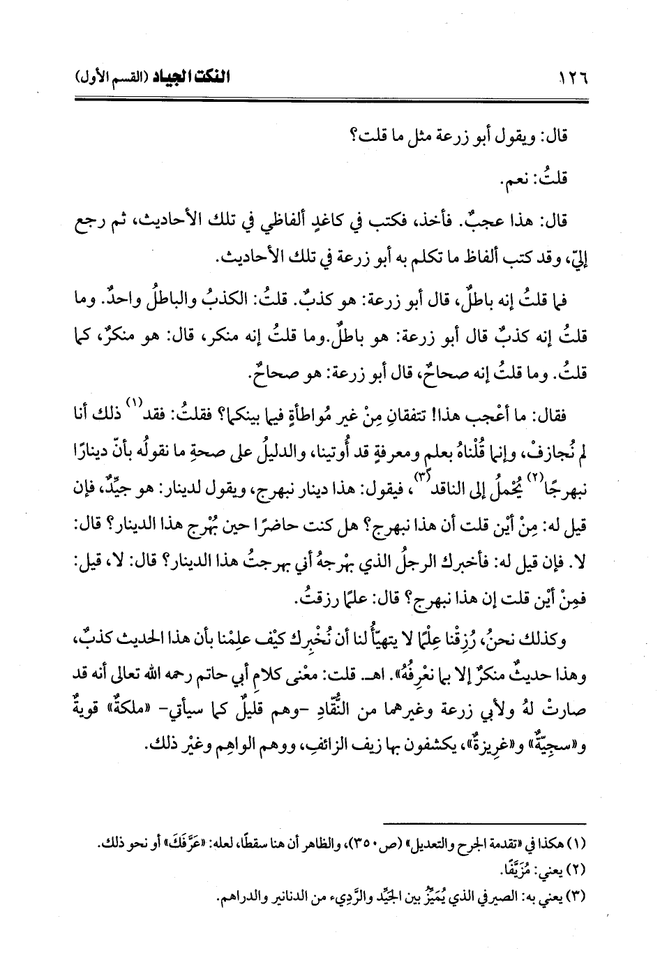 وكذلك نحنُ، رُزِقْنا عِلْما لا يتهيّأُ لنا أن نُخْبِرك كيْف علِمْنا بأن هذا الحديث كذبٌ، وهذا حديثٌ منكرٌ إلا بما نعْرِفُهُ". اهـ. قلت: معْنى كلامِ أبي حاتم رحمه الله تعالى أنه قد صارتْ لهُ ولأبي زرعة وغيرهما من النُّقادِ -وهم قليلٌ كما سيأتي- "ملكةٌ" قويةٌ و"سجِيّةٌ" و"غرِيزةٌ"، يكشفون بها زيف الزائفِ، ووهم الواهِم وغيْر ذلك.