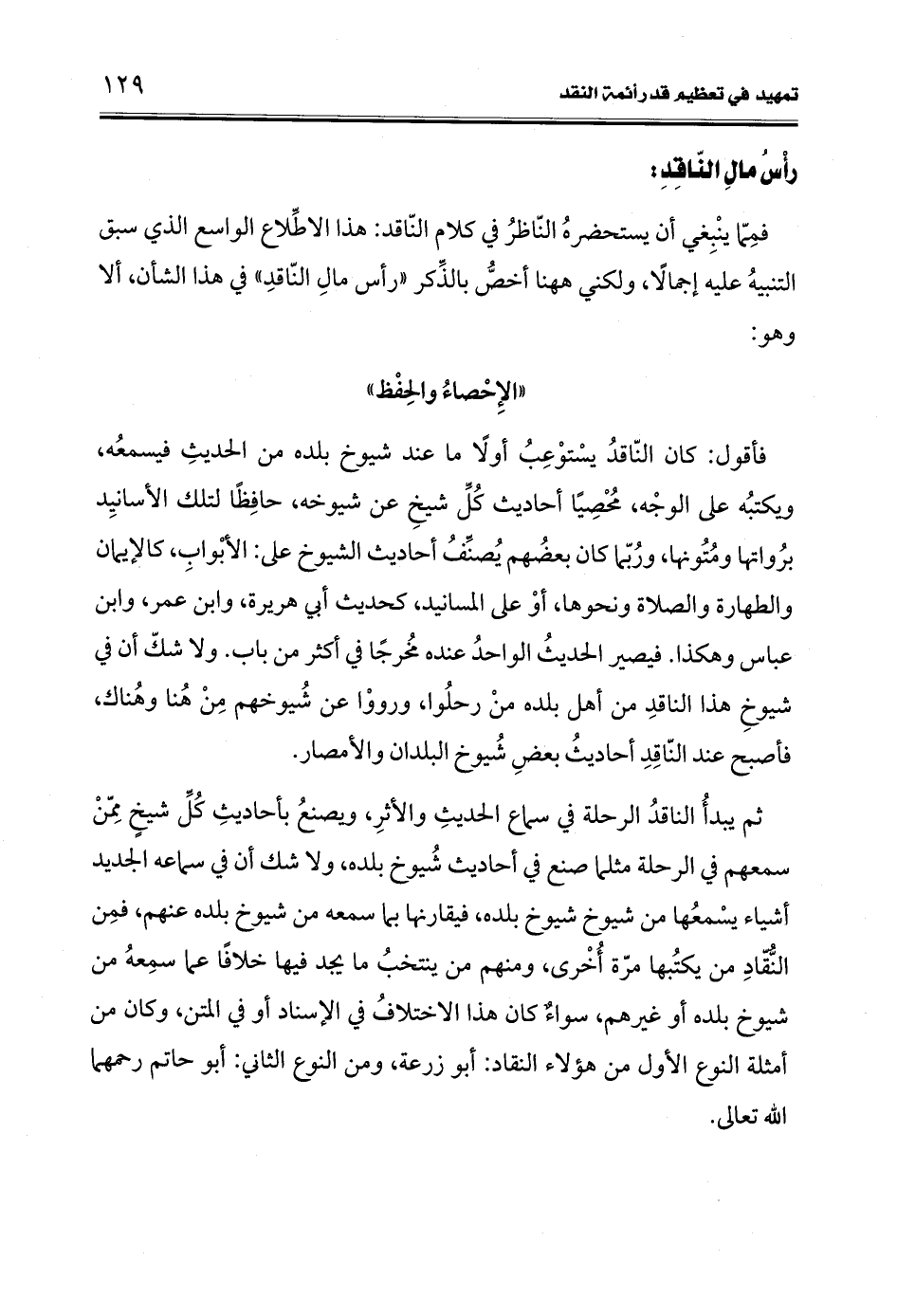 فمِمّا ينْبِغي أن يستحضرهُ النّاظرُ في كلام النّاقد: هذا الاطِّلاع الواسع الذي سبق التنبيهُ عليه إجمالًا، ولكني هاهنا أخصُّ بالذِّكر "رأس مالِ النّاقدِ" في هذا الشأن، ألا وهو: