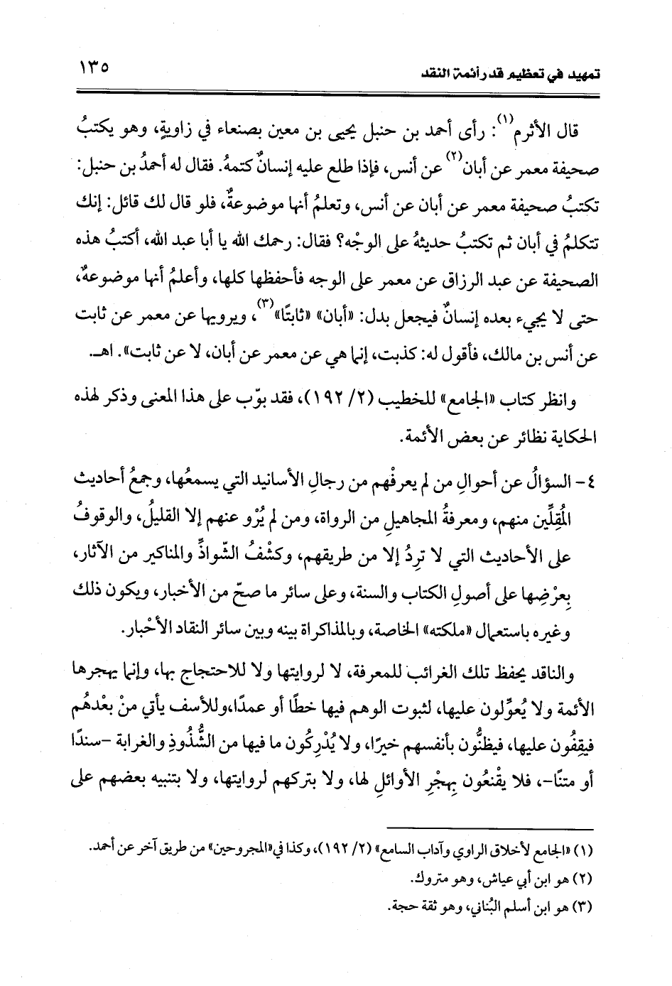 قال الأثرم (¬1): رأى أحمد بن حنبل يحيى بن معين بصنعاء في زاويةٍ، وهو يكتبُ صحيفة معمر عن أبان (¬2) عن أنس، فإذا طلع عليه إنسانٌ كتمهُ. فقال له أحمدُ بن حنبل: تكتبُ صحيفة معمر عن أبان عن أنس، وتعلمُ أنها موضوعةٌ، فلو قال لك قائل: إنك تتكلمُ في أبان ثم تكتبُ حديثهُ على الوجْه؟ فقال: رحمك الله يا أبا عبد الله، أكتبُ هذه الصحيفة عن عبد الرزاق عن معمر على الوجه فأحفظها كلها، وأعلمُ أنها موضوعةٌ، حتى لا يجيء بعده إنسانٌ فيجعل بدل: "أبان" "ثابتًا" (¬3)، ويرويها عن معمر عن ثابت عن أنس بن مالك، فأقول له: كذبت، إنما هي عن معمر عن أبيان، لا عن ثابت". اهـ.