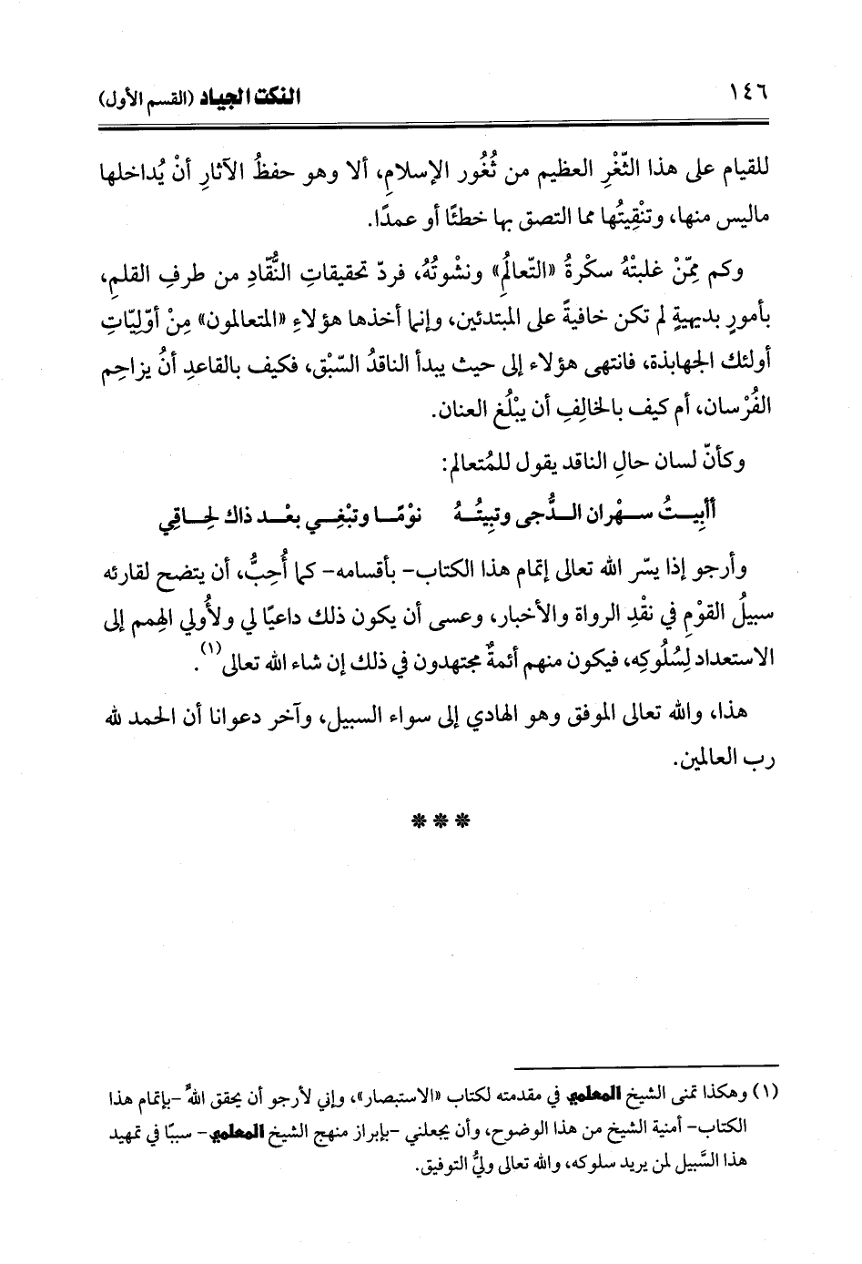 وكم مِمّنْ غلبتْهُ سكْرةُ "التّعالُمِ" ونشْوتُهُ، فردّ تحقيقاتِ النُّقّادِ من طرفِ القلمِ، بأمورٍ بديهيةٍ لم تكن خافيةً على المبتدئين، وإنما أخذها هؤلاءِ "المتعالمون" مِنْ أوّلِيّاتِ أولئك الجهابذة، فانتهى هؤلاء إلى حيث يبدأ الناقدُ السّبْق، فكيف بالقاعدِ أنُ يزاحِم الفُرْسان، أم كيف بالخالِفِ أن يبْلُغ العنان.