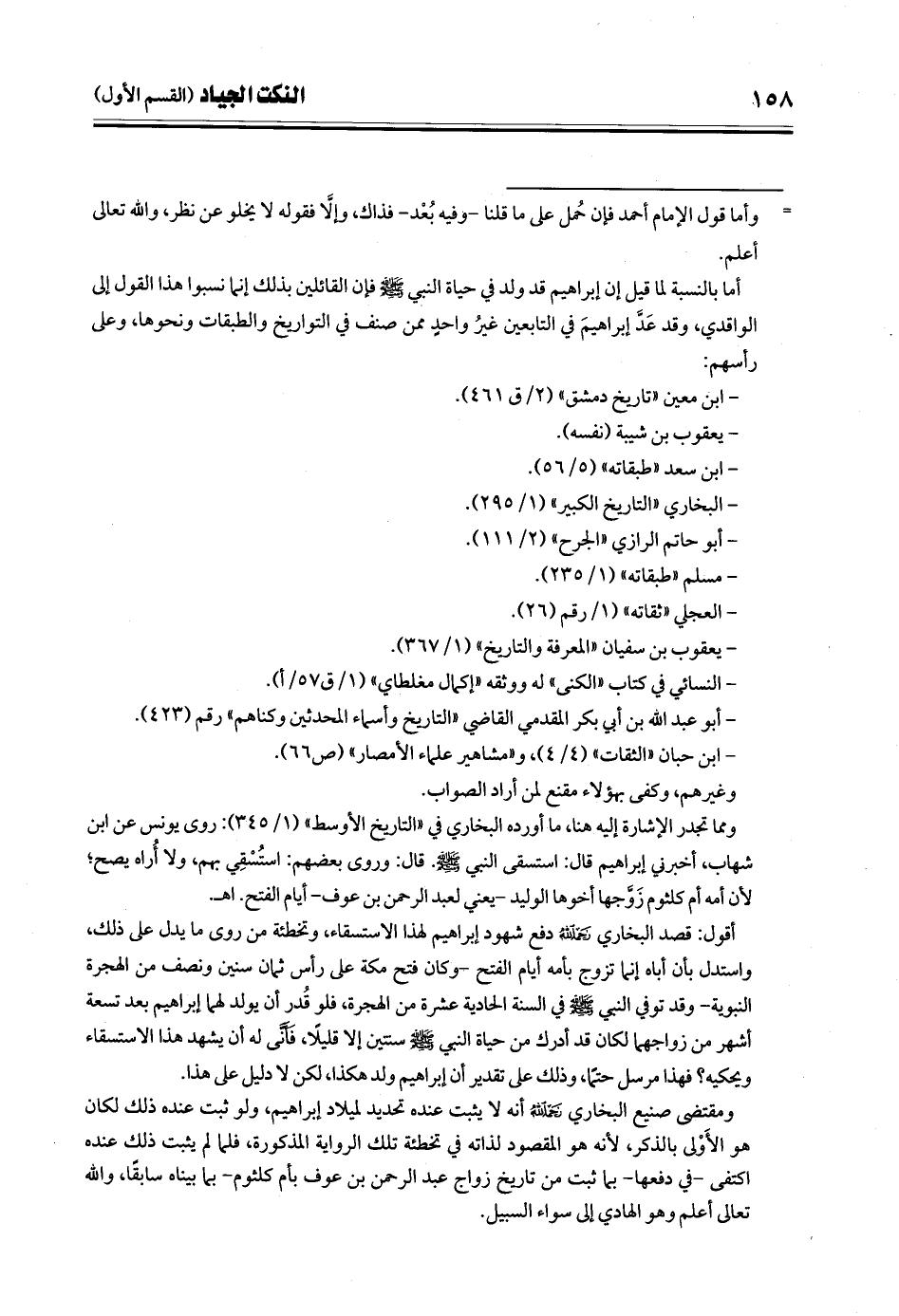 ومقتضى صنيع البخاري رحمه الله أنه لا يثبت عنده تحديد لميلاد إبراهيم، ولو ثبت عنده ذلك لكان هو الأَولى بالذكر، لأنه هو المقصود لذاته في تخطئة تلك الرواية المذكورة، فلما لم يثبت ذلك عنده اكتفى -في دفعها- بما ثبت من تاريخ زواج عبد الرحمن بن عوف بأم كلثوم - بما بيناه سابقًا، والله تعالى أعلم وهو الهادي إلى سواء السبيل.