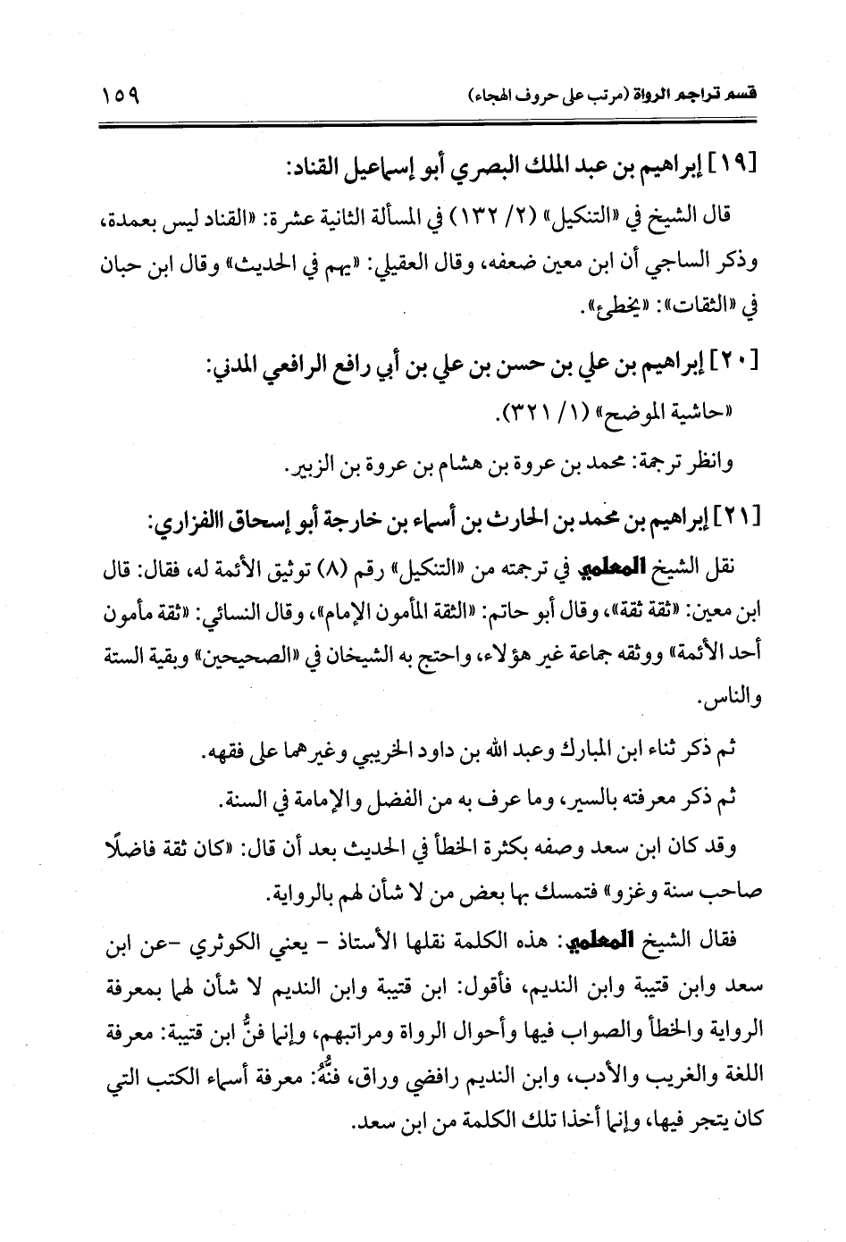 فقال الشيخ المعلمي: هذه الكلمة نقلها الأستاذ -يعني الكوثري- عن ابن سعد وابن قتيبة وابن النديم، فأقول: ابن قتيبة وابن النديم لا شأن لهما بمعرفة الرواية والخطأ والصواب فيها وأحوال الرواة ومراتبهم، وإنما فنُّ ابن قتيبة: معرفة اللغة والغريب والأدب، وابن النديم رافضي وراق، فنُّهُ: معرفة أسماء الكتب التي كان يتجر فيها، وإنما أخذا تلك الكلمة من ابن سعد.