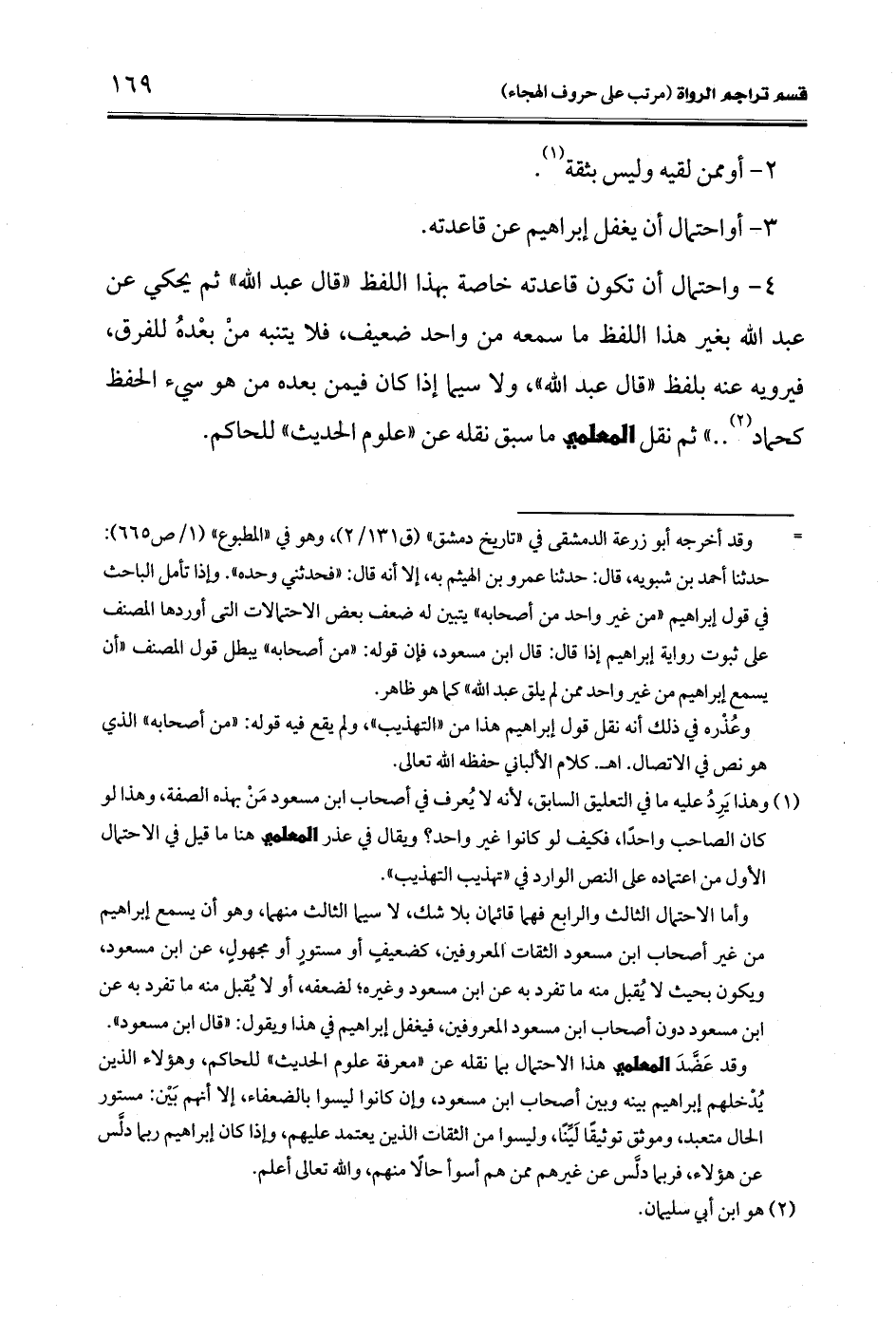 وقد عَضَّدَ المعلمي هذا الاحتمال بما نقله عن "معرفة علوم الحديث" للحاكم، وهؤلاء الذين يُدْخلهم إبراهيم بينه وبين أصحاب ابن مسعود، وإن كانوا ليسوا بالضعفاء، إلا أنهم بَيْن: مستور الحال متعبد، وموثق توثيقًا لَيِّنًا، وليسوا من الثقال الذين يعتمد عليهم، وإذا كان إبراهيم ربما دلَّس عن هؤلاء، فربما دلَّس عن غيرهم ممن هم أسوأ حالًا منهم، والله تعالى أعلم.