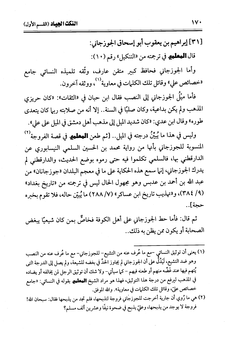 (¬1) يعني أن توثيق النسائي -مع ما عُرف عنه من التشيع- للجوزجاني- مع ما عُرف عنه من النصب وهو ضد التشيع، لَيَدُلُّ على أن الجوزجاني لم يجاوز الحدَّ في بغضه للشيعة، ولم يصل إلى الدرجة التى يُتهم فيها عند غَضِّه منهم أو طعنه فيهم -كما سيأتي- ولا شك أن توثيق الرجل لمن يخالفه أو يضاده في المذهب ليرفع من درجة هذا التوثيق، فهذا هو مراد الشيخ المعلمي بقوله في النسائي: "جامع خصائص عليّ، وقائل تلك الكلمات في معاوية". والله الموفق.