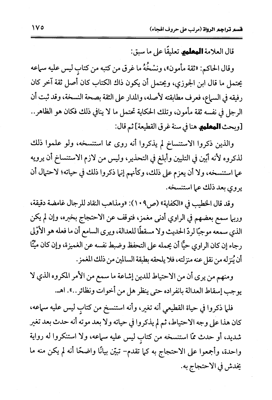 وقال الحاكم: "ثقة مأمون"، ونسْخُهُ ما غرق من كتبه من كتابٍ ليس عليه سماعه يحتمل ما قال ابن الجوزي، ويحتمل أن يكون ذاك الكتاب كان أصل ثقة آخر كان رفيقه في السماع، فعرف مطابقته لأصله، والمدار على الثقة بصحة النسخة، وقد ثبت أن الرجل في نفسه ثقة مأمون، وتلك الحكاية تحتمل ما لا ينافي ذلك فكان هو الظاهر .. [وبحث المعلمي هنا في سنة غرق القطيعة] ثم قال:
