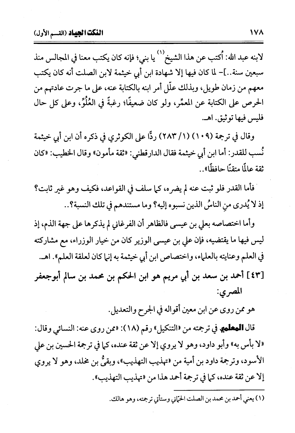 وقال في ترجمة (109) (1/ 283) ردًّا على الكوثري في ذكره أن ابن أبي خيثمة نُسب للقدر: أما ابن أبي خيثمة فقال الدارقطني: "ثقة مأمون" وقال الخطيب: "كان ثقة عالمًا متقنًا حافظًا" ..