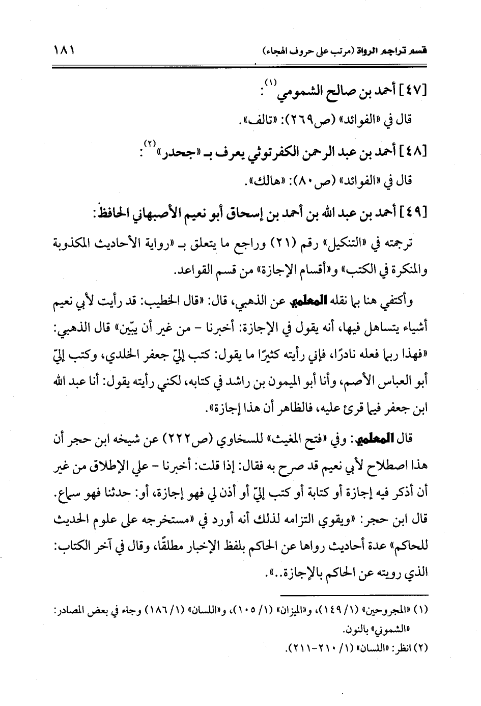 قال المعلمي: وفي "فتح المغيث" للسخاوي (ص 222) عن شيخه ابن حجر أن هذا اصطلاح لأبي نعيم قد صرح به فقال: إذا قلت: أخبرنا - علي الإطلاق من غير أن أذكر فيه إجازة أو كتابة أو كتب إليّ أو أذن لي فهو إجازة، أو: حدثنا فهو سماع. قال ابن حجر: "ويقوي التزامه لذلك أنه أورد في "مستخرجه على علوم الحديث للحاكم" عدة أحاديث رواها عن الحاكم بلفظ الإخبار مطلقًا، وقال في آخر الكتاب: الذي رويته عن الحاكم بالإجازة .. ".