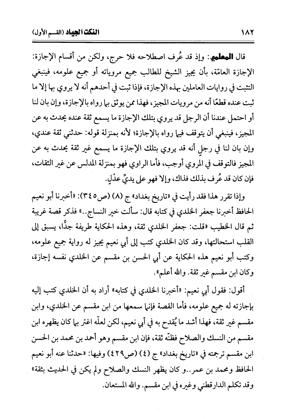 وإذا تقرر هذا فقد رأيت في "تاريخ بغداد" ج (8) (ص 34): "أخبرنا أبو نعيم الحافظ أخبرنا جعفر الخلدي في كتابه قال: سألت خير النساج .. " فذكر قصة غريبة ثم قال الخطيب "قلت: جعفر الخلدي ثقة، وهذه الحكاية طريفة جدًّا، يسبق إلى القلب استحالتها، وقد كان الخلدي كتب إلى أبي نعيم يجيز له رواية جميع علومه، وكتب أبو نعيم هذه الحكاية عن أبي الحسن بن مقسم عن الخلدي نفسه إجازة، وكان ابن مقسم غير ثقة. والله أعلم".