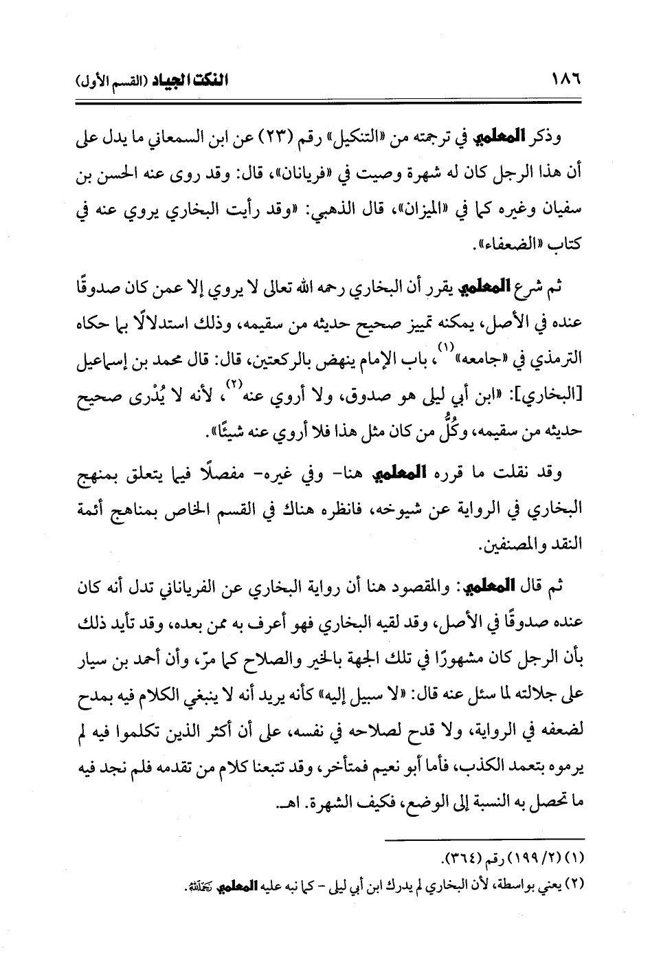 ثم شرع المعلمي يقرر أن البخاري رحمه الله تعالى لا يروي إلا عمن كان صدوقًا عنده في الأصل، يمكنه تمييز صحيح حديثه من سقيمه، وذلك استدلالًا بما حكاه الترمذي في "جامعه" (¬1)، باب الإمام ينهض بالركعتين، قال: قال محمد بن إسماعيل [البخاري]: "ابن أبي ليلى هو صدوق، ولا أروي عنه (¬2)، لأنه لا يُدْرى صحيح حديثه من سقيمه، وكُلُّ من كان مثل هذا فلا أروي عنه شيئًا".